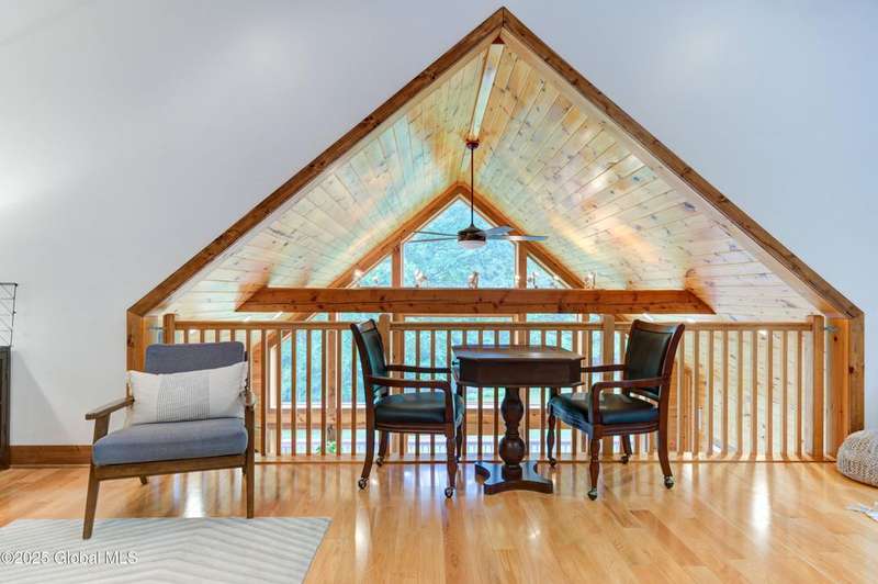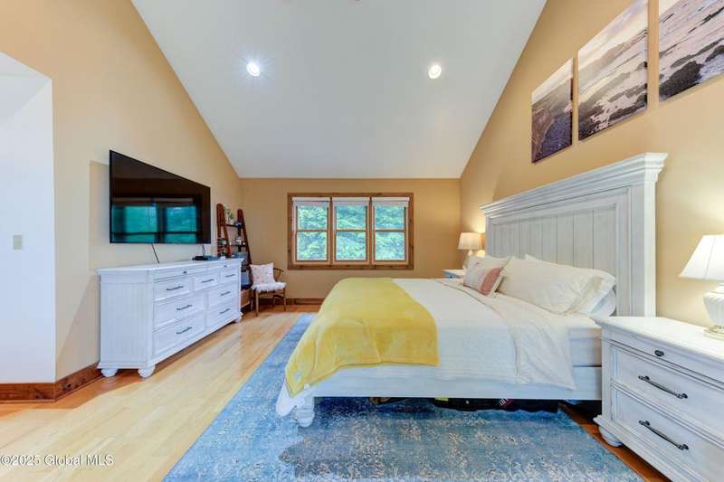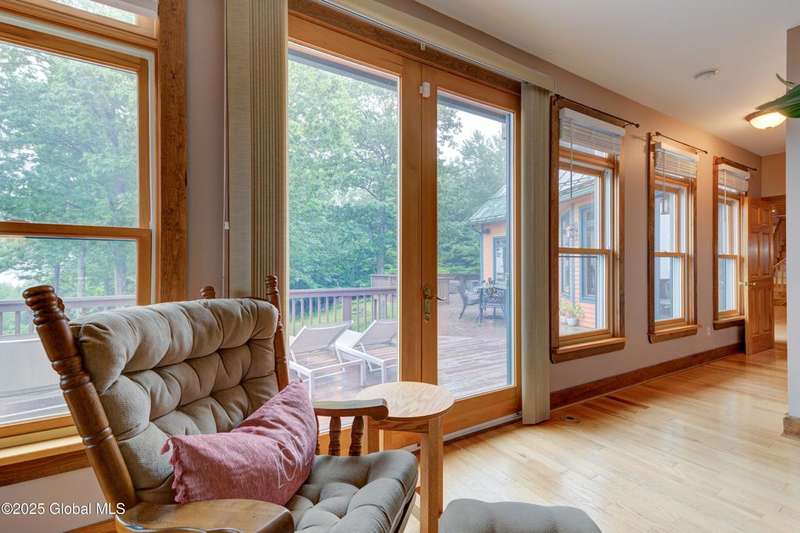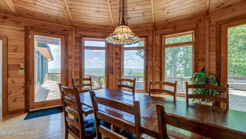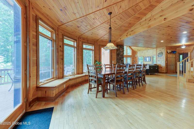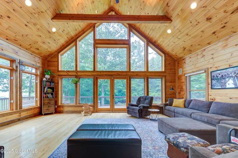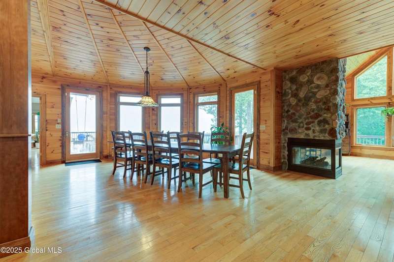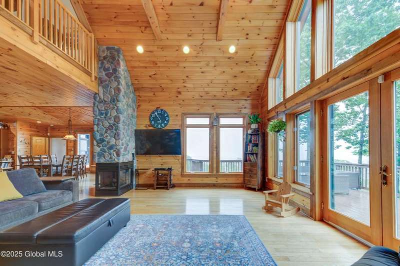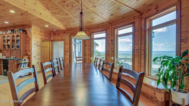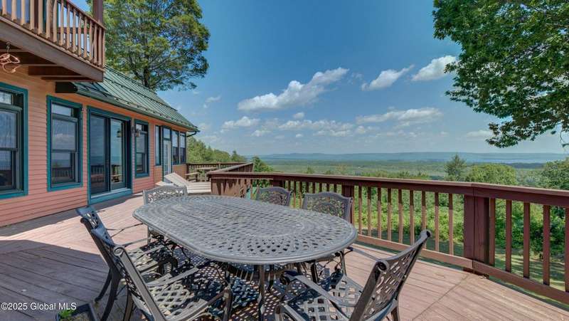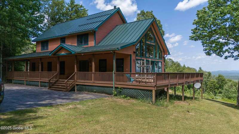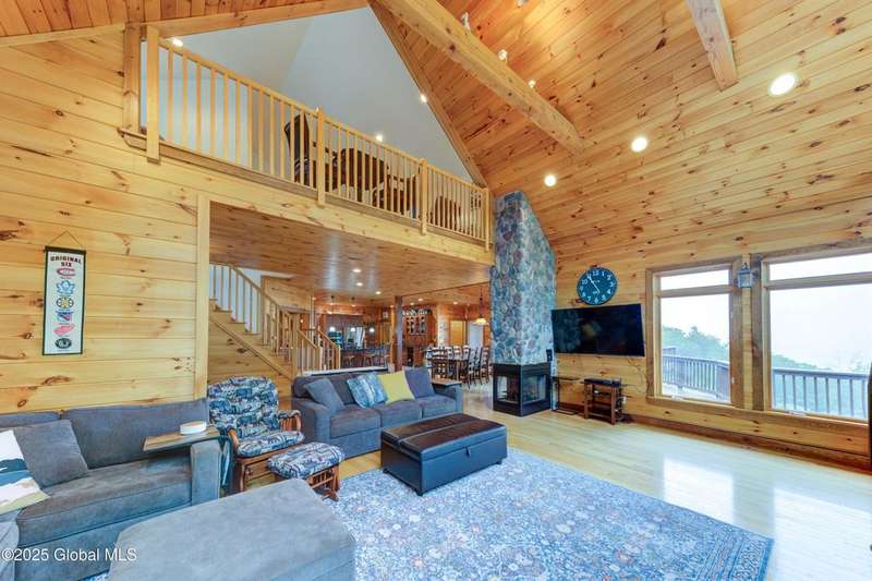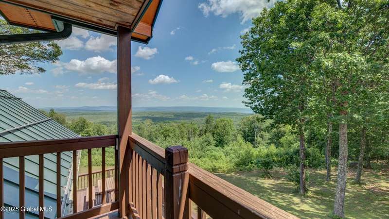 Discover the pinnacle of ADK living in this 6 bedroom 4.5 bath custom-built residence, set atop 43 secluded mountain acres w/ sweeping views of Great Sacandaga Lake. This home has been crafted for both luxury & comfort. Great room w/ vaulted ceilings, a stone fireplace, & custom woodwork. Gourmet kitchen features stone countertops & a large peninsula for casual eat-in dining, plus large dining space w/spectacular views. Two spacious primary suites, each with walk-in closets & en-suite baths; one w/private access to a sunroom / artist's studio; the other w/ a private balcony. Inviting, large front porch & expansive decks. Walk out basement w/ gym & dedicated hot tub room for ultimate relaxation. Detached heated garage currently functioning as a woodshop, plus newer metal barn.