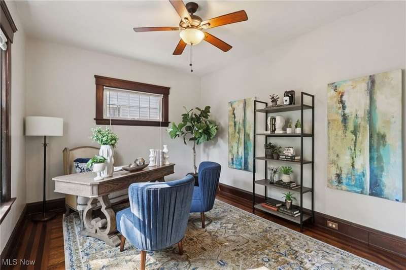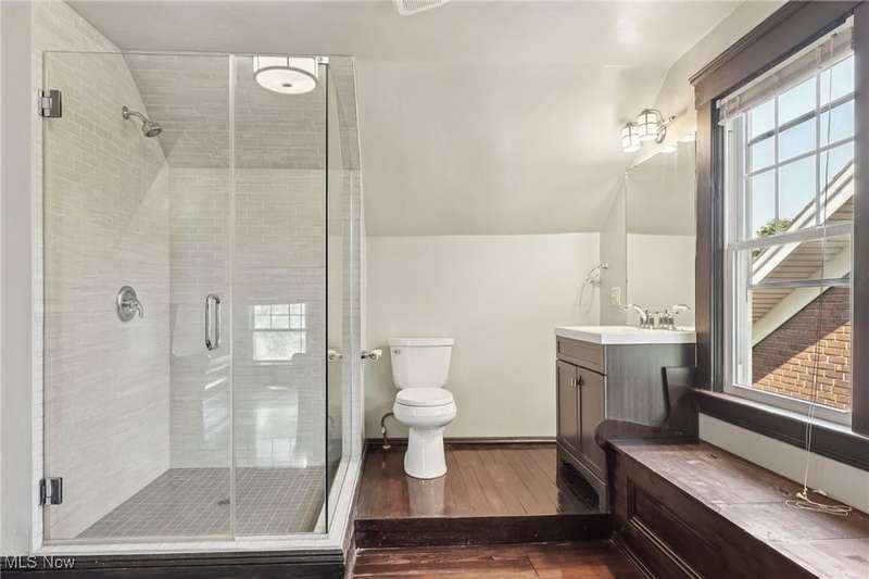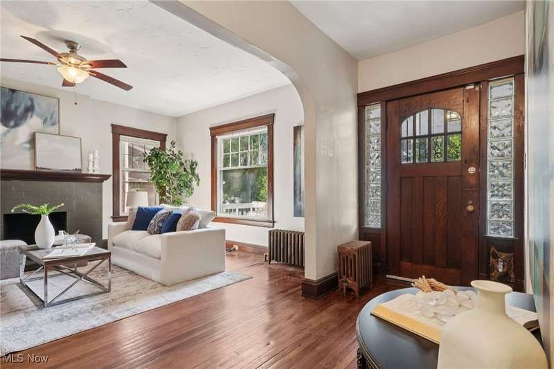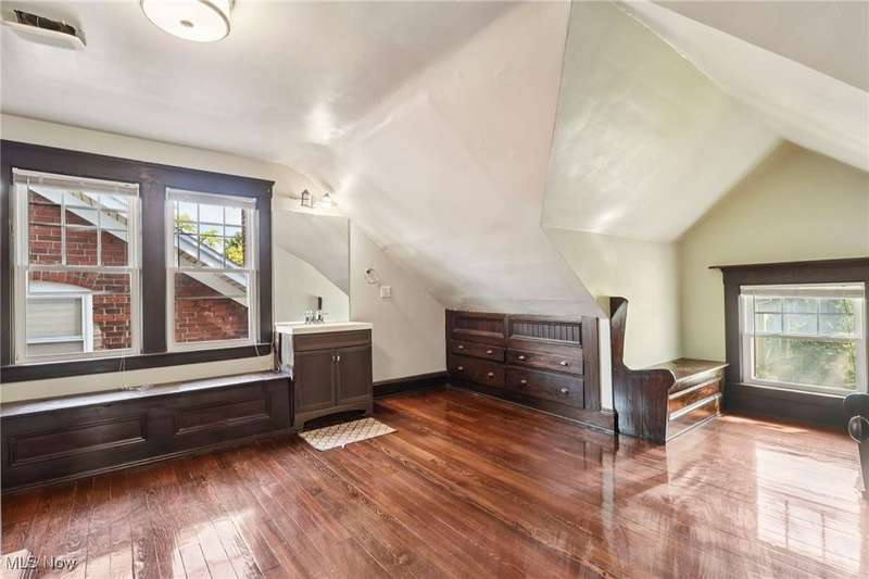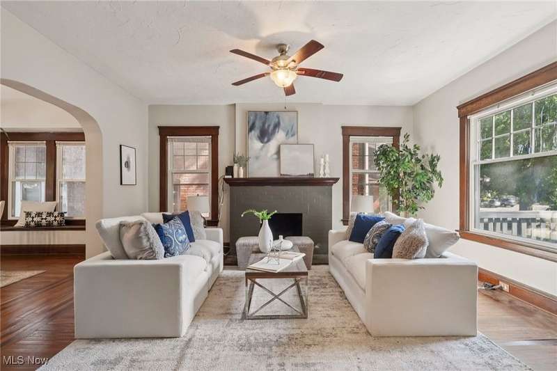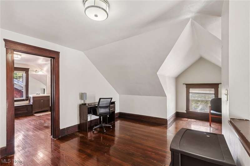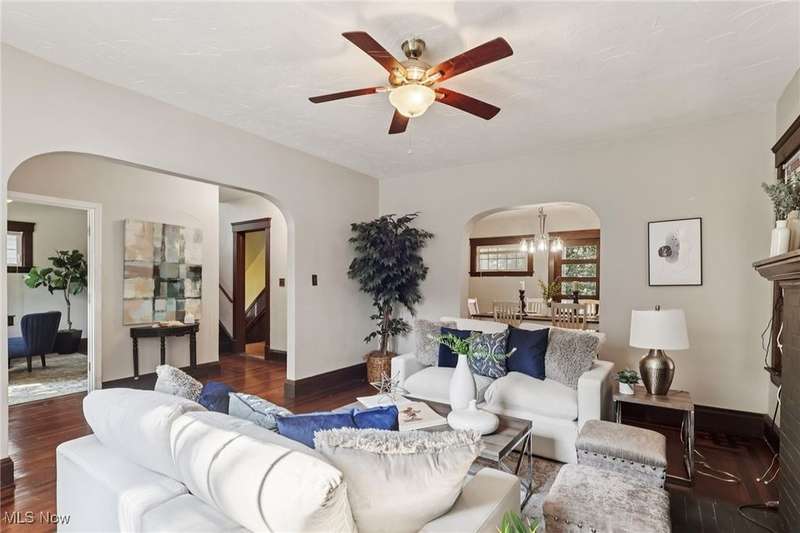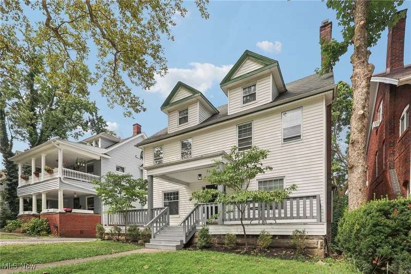 Thoughtful updates and architectural charm in this classic Cleveland Heights front-porch Colonial Revival. Living room with brick hearth and wood mantle greets you off foyer. Bright, white kitchen with stainless steel appliances and some vintage original cabinets, with formal dining room adjacent featuring door to rear deck. First floor half bath and spacious home office finishes the first floor. Rich Red Oak hardwood flooring throughout, and make sure to look in the dining room and living room to see the inlaid Celtic knot pattern - quality and character that is not found in newer homes. 2nd-floor has four well-sized bedrooms with refreshed full bath. Third floor primary suite has a vaulted sleeping area, reading nooks with window benches, much space for dressing area or work desks, and an enormous primary en-suite with double vanity and tiled glass shower. This space adds 786 sq/ft of finished living space not counted in square footage. Newly-waterproofed and finished basement adds yet more living space, a third full bath, as well as a laundry area and storage/utilities rooms. Don't forget the laundry chute, a real convenience in a home this size! Newer vinyl windows throughout. Rear features include 1-car garage, and a natural-state yard you can enjoy from the rear decks. Location is amazing - just steps to Cedar/Fairmount restaurants and shops, a jog or short bike ride to Case/Cleveland Clinic/UH/University Circle, and a short jaunt downtown. Or go the other way and find Doane Brook hiking a 5-minute walk from your home. Point-of-sale compliant!