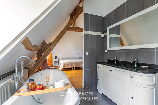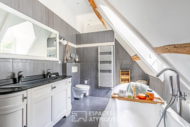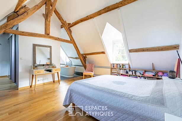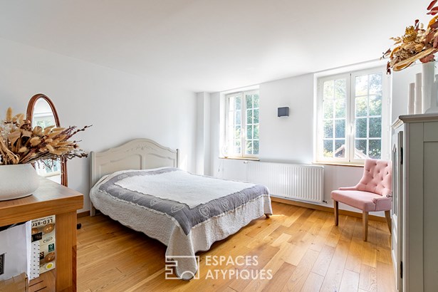 The ground floor is dedicated to family life with a large living room and the open fitted/equipped kitchen which promises good times shared as well as a pantry and access to the vaulted cellar, perfectly sound. The staircase leads upstairs where a wide corridor serves two beautiful bedrooms, a shower room and a toilet. It continues its course to the second floor where is the master suite with a large dressing room and a bathroom with bathtub, shower and toilet. Beautiful finishes. Schools and shops within walking distance.