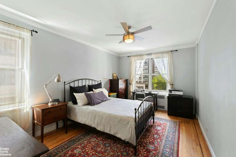One enters into a spacious entry foyer, ideally suited for a home office or dining area. The graciously proportioned sunken living room has lovely light from a northern exposure. An oversized, windowed kitchen and windowed bathroom provide natural light and  ventilation. The king-sized bedroom has two exposures and excellent closet space. Other apartment features include abundant storage, 8'8" ceilings, and oak hardwood floors.