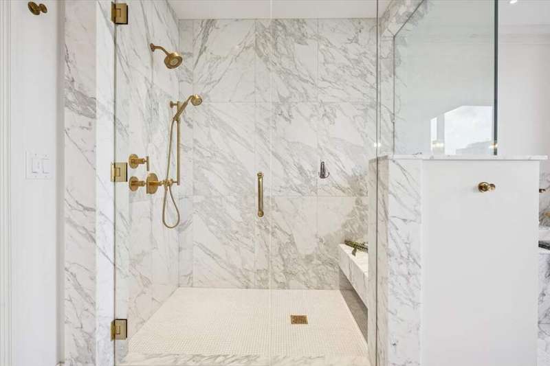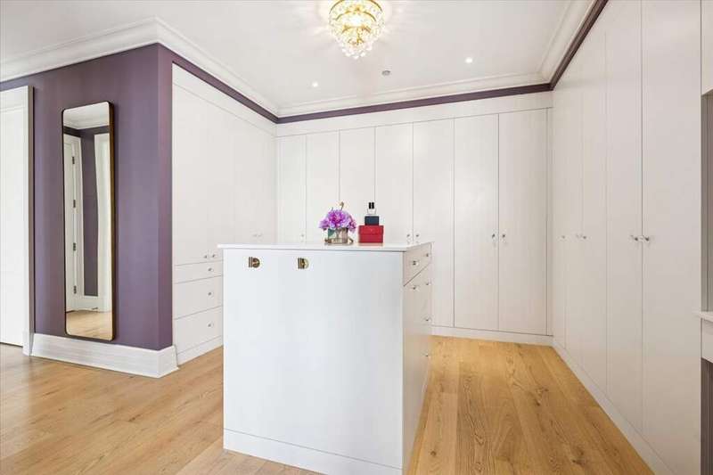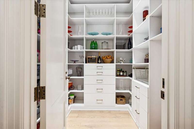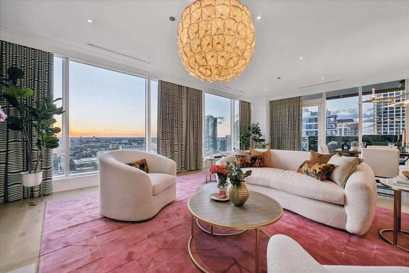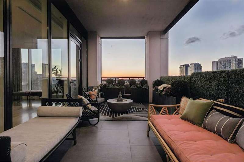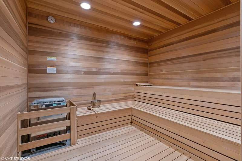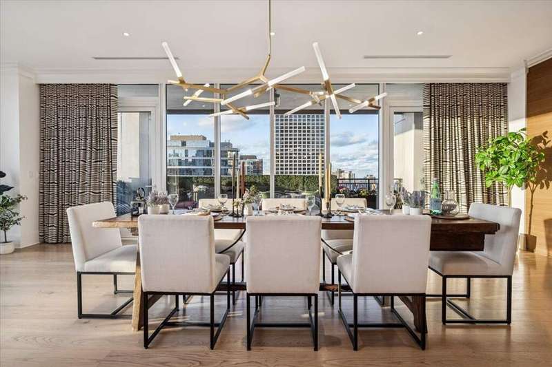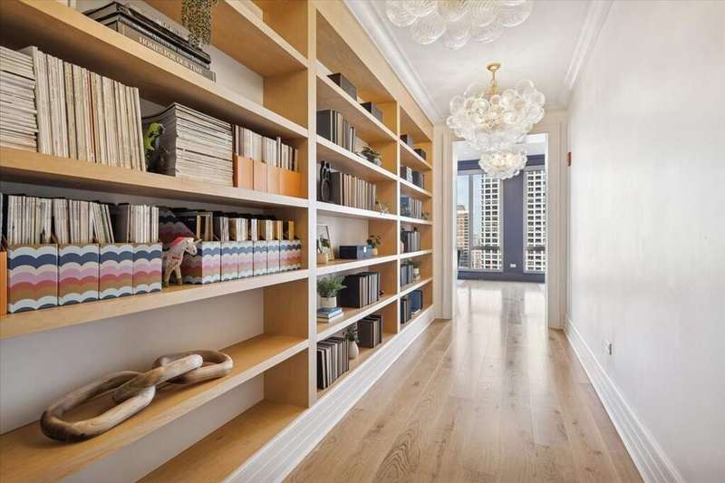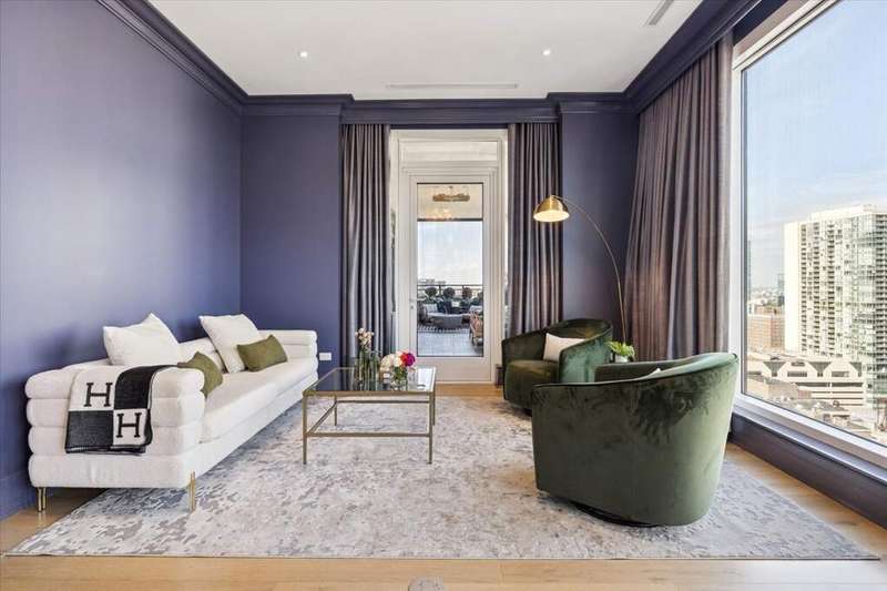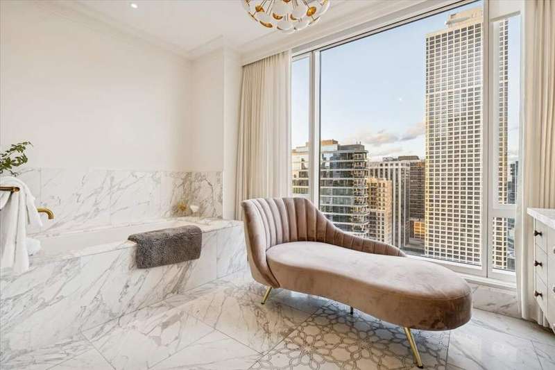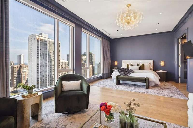 This remarkable 4-bedroom plus office, 4.1-bath corner residence is perfectly positioned on the 22nd floor of one of the Gold Coast's most prestigious addresses, capturing breathtaking lake and sunset city views. Rarely available, the expansive layout is bathed in natural light, with bespoke, black and white marble mosaic tile setting a tone of refined sophistication from the moment you are welcomed by the foyer. With wide-plank white oak floors leading you through abundant storage within the entry halls, distinctive touches abound, such as the frontmost powder room adorned with hand-painted Paul Montgomery wallpaper and a collection of thirty carefully curated bespoke pendant lights from Design within Reach, Rejuvenation, Lightology, and 1st Dibs including antiques from Italy and France. The chef's kitchen is a true showpiece, appointed with O'Brien Harris custom solid walnut kitchen cabinetry and Buster + Punch brass hardware, Wolf appliances-including dual ovens-and a striking Calacatta marble island with an integrated stovetop and pop-up hood. Practicality meets luxury with two 30" Designer Over-and-Under Sub-Zero Legacy Model Refrigerator/Freezers and a plentiful walk-in pantry. While cooking dinner at sunset, one looks out at floor-to-ceiling windows framing sweeping panoramas across the open living and dining areas. The perfect setting for relaxation and entertaining is enhanced by custom drapery throughout, crafted with designer fabrics including Dedar Milano silks and Jean-Paul Gaultier for Lelievre. Entering each living space through solid maple double doors surrounded by custom-carved millwork, the family room and study extend the home's versatility while each bedroom boasts its own full ensuite with radiant heated floors, ensuring privacy and comfort. Custom floating walnut vanities are topped with marble and accompanied by bespoke tile and hardware finishes. The primary suite occupies its own wing, complete with terrace access, a custom walk-in dressing room with storage for all seasons, and a spa-inspired bath featuring an extra large soaking tub with lake views. Additional conveniences include Control4 integration for commanding lights, shades, curtains, TVs, and the state-of-the-art sound system with invisible speakers throughout the home and on the deck, a full laundry room with new Samsung SmartThings washer & dryer and sink, an upgraded private storage room instead of locker, and two assigned parking spaces. Residents enjoy full-service living with five-star amenities and white-glove service: 24-hour door staff, optional valet, an indoor pool and spa, a two-story fitness center, golf simulator, wine storage, guest suites, and beautifully designed entertaining spaces including a catering kitchen, bar, and expansive hosting terrace. Just moments from Chicago's celebrated restaurants, cultural destinations, parks, and Lake Michigan, this residence offers a rare combination of scale, sophistication, and service creating an unparalleled opportunity for luxury city living.