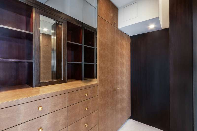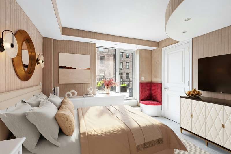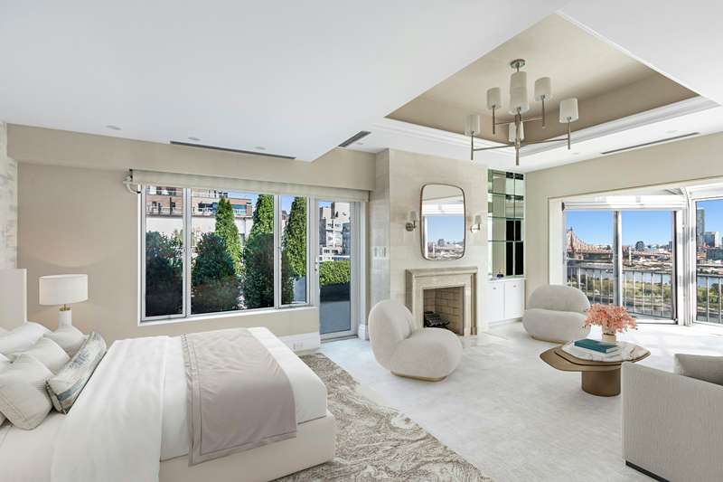 The impressive yet inviting staircase replete with mahogany and Phillip Jeffries wallpaper takes you upstairs to one of the most replete primary bedroom suites found on the East Side. Two dressing rooms and two full bathrooms with heated floors are just the beginning of everything this palatial suite has to offer. Access the first dressing room from the landing, with built-in mahogany dressers, closets with full length mirrors laid into the intricate woodwork, and a rolling ladder to accommodate the extended storage granted by 10-foot-high ceilings. The generously-sized second dressing room, with pleather-covered built-in dressers and mahogany cabinetry, has its own full bathroom with glass encased spa steam shower and Toto heated self-cleaning toilet. The crown jewel of this space is twofold: the private terrace with 13 feet of unobstructed river views and the sunroom that encases the second full bathroom as well as the adjacent office. Relax at the end of the day in your own private spa with a soaking tub overlooking the East River as you watch Roosevelt Island and beyond illuminate at night. This luxurious primary suite is complete with a working fireplace as well as additional storage hidden in the ceiling.