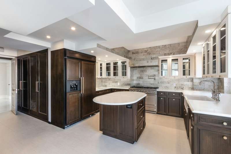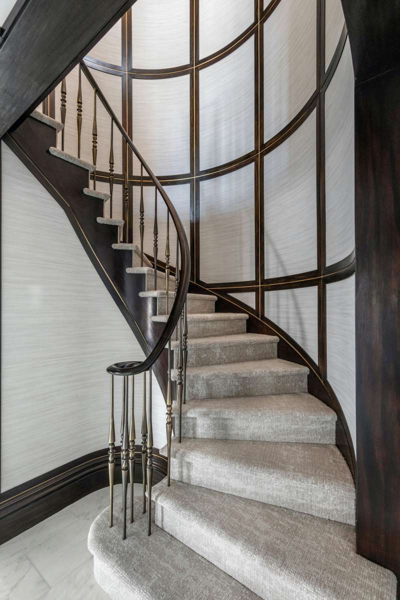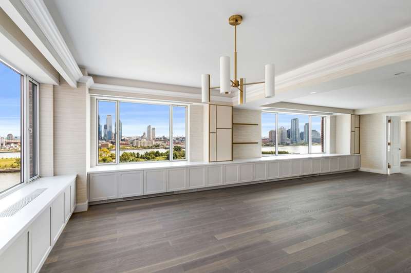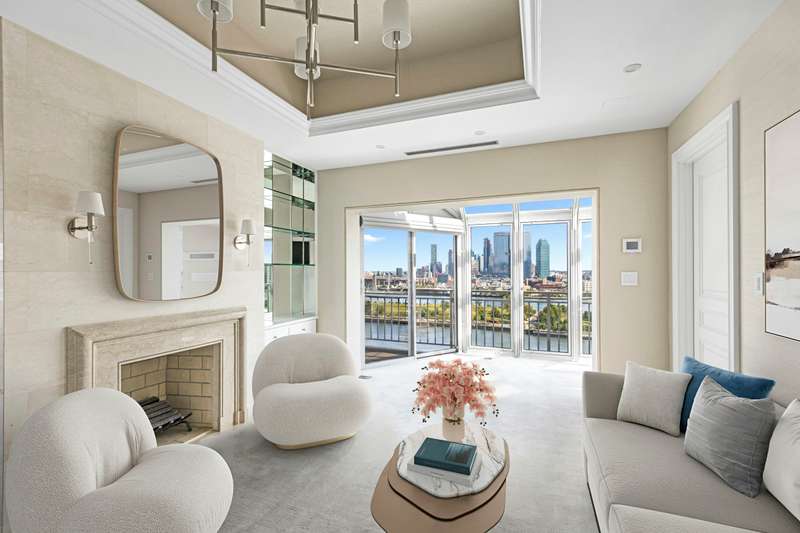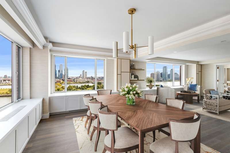 Occupying the top two levels of the south tower, no detail was overlooked when creating this dreamscape perched high above the East River Promenade. A Carrara marble tiled foyer greets you as you enter the lower floor of this residence. Here you will find the kitchen, dining room, living room, den/library and one of three bedrooms. Custom millwork abounds, with closets integrated seamlessly into the Phillip Jeffries wallcoverings. The eat-in-kitchen, with Ann Sacks tiles and backsplash, features a La Cornue French range with pot filler faucet, dual dishwashers, and several rich-wood storage closets with slide out drawers for ease of access. There is also a dedicated laundry closet with an in-unit Miele washer and dryer. The expansive dining room flows directly onto the graceful and spacious living room, which features the first of two working fireplaces. Just beyond the living room lies a separate library that can serve as a media room or den, creating a full 65 feet of unobstructed river frontage that can fulfill any entertainment need you could imagine, whether that be intimate gatherings or large celebrations.