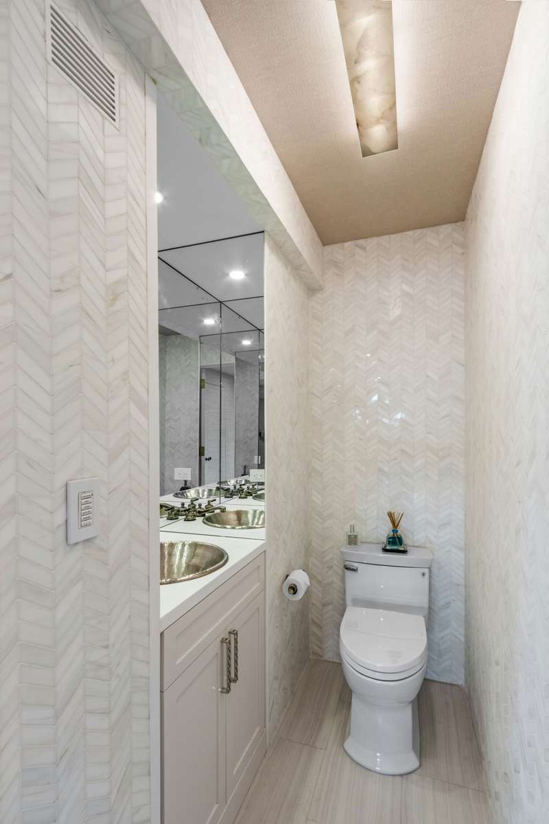 Enter the lower floor terrace through the library or the adjacent bedroom with walls covered in fine ultra-suede, two large custom closets, and its own en-suite bathroom. Each terrace features a self-irrigation drip system as well as access to water and electric. A powder room, done by Artistic Tile, just off of the foyer and next to the sweeping staircase, completes the lower floor.