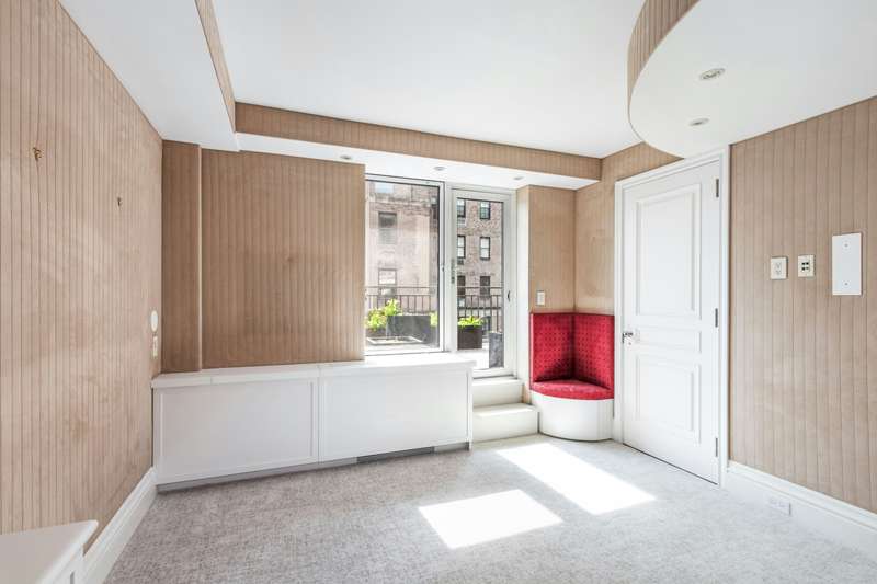 The third terrace, located on this level, can be entered through the primary suite's office or from the bright and airy third bedroom. A built-in desk with shelving in addition to custom closets, an en-suite bathroom, and quilted fabric walls finish off this third and final bedroom. A Lutron system is found throughout the apartment.