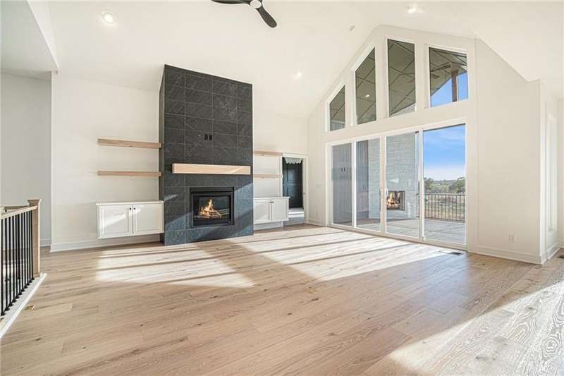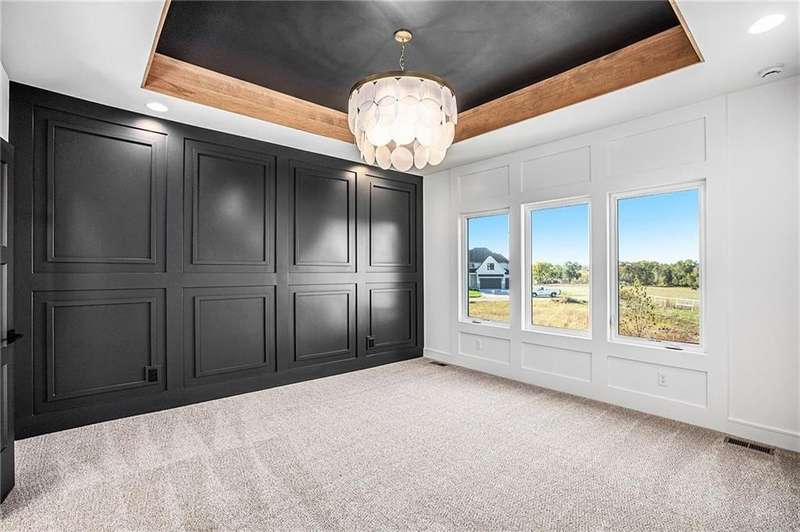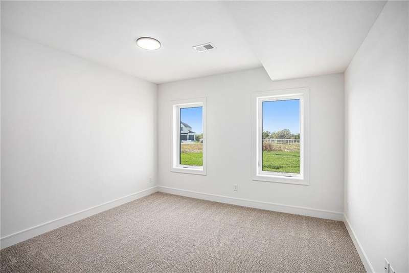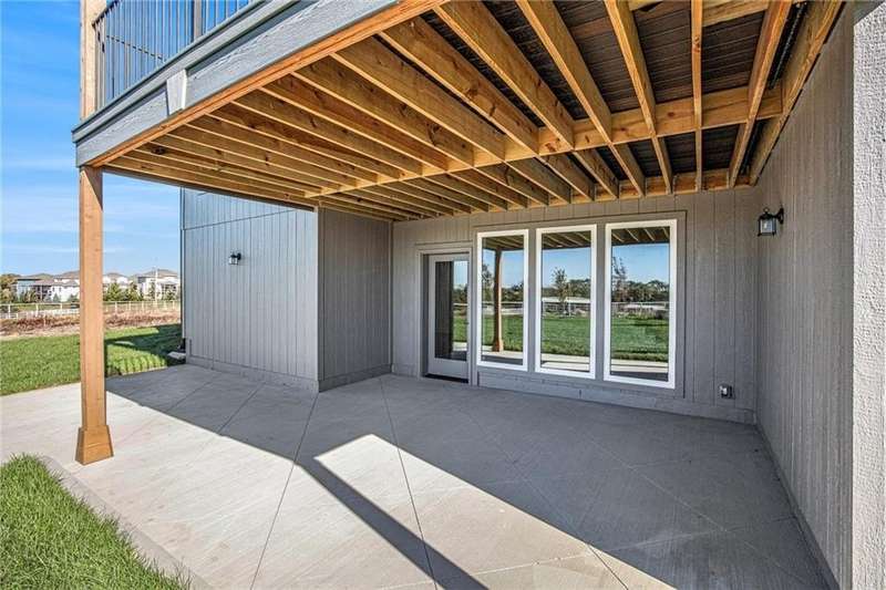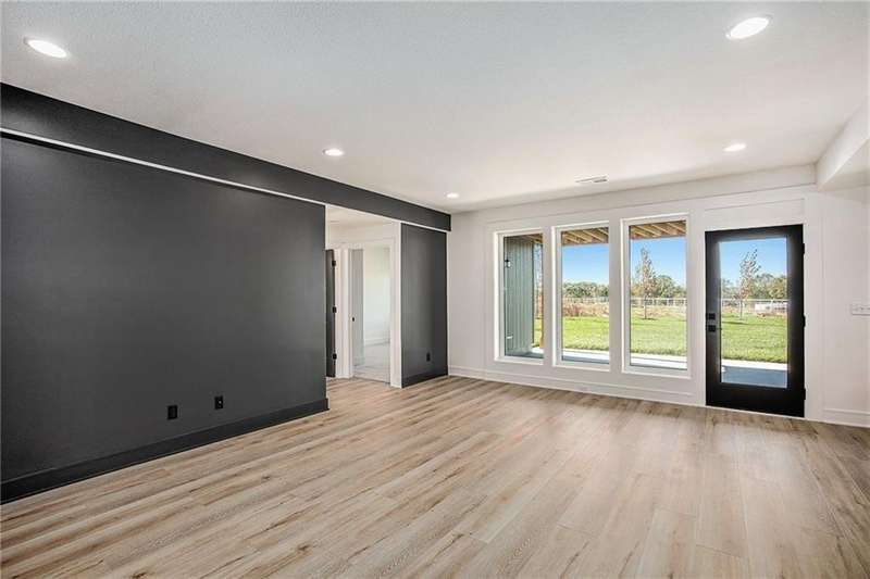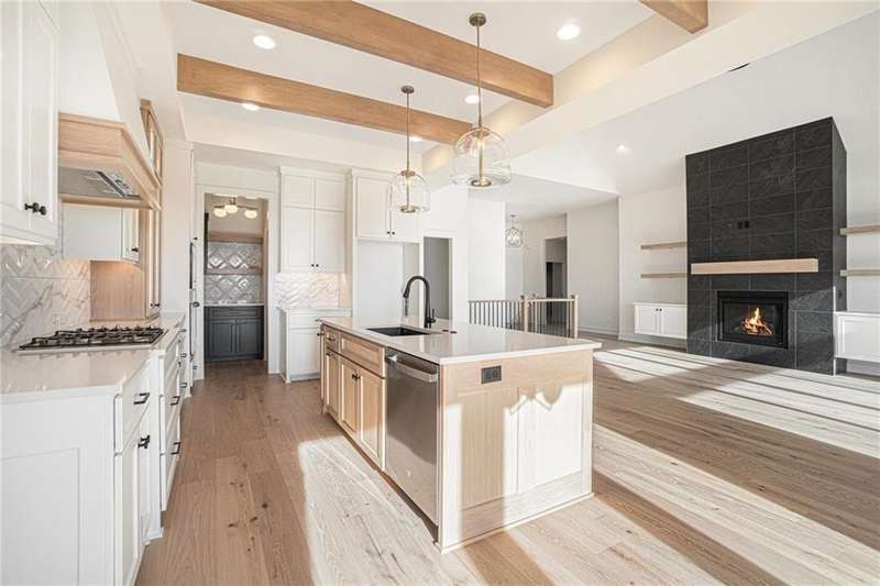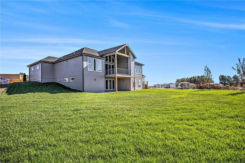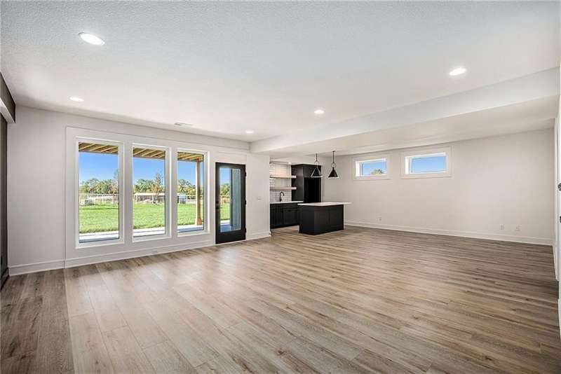 MOVE IN READY -"The Bayberry I" by JFE Construction, situated on Lot 90, is a Reverse 1 ½ Story residence featuring four bedrooms and three bathrooms. Upon entry through the impressive 8-foot double doors, residents are greeted by a spacious great room showcasing a vaulted ceiling, floor-to-ceiling fireplace, and expansive windows that create an open atmosphere. Large sliding doors seamlessly connect the great room to a covered deck equipped with a stone fireplace, offering an ideal space for entertaining. The kitchen is thoughtfully designed with a substantial island finished in quartz, stainless steel appliances, and a generous pantry that includes a built-in coffee bar. The primary ensuite features a free-standing soaker tub, double vanity, zero-entry shower, and a walk-in closet. A secondary bedroom or office is located on the main level. The finished lower level provides a family room, wet bar with island, two additional bedrooms, and a full bathroom. Enjoy access to the covered deck from the walkout lower level. Minutes from Blue Valley K-12 schools. Taxes are estimated. Models Open Daily, 11 am – 5pm, and Sunday, 12-5pm. Visit the sales office at 12411 W 183rd Terrace, Overland Park. THIS HOME IS MOVE IN READY.
