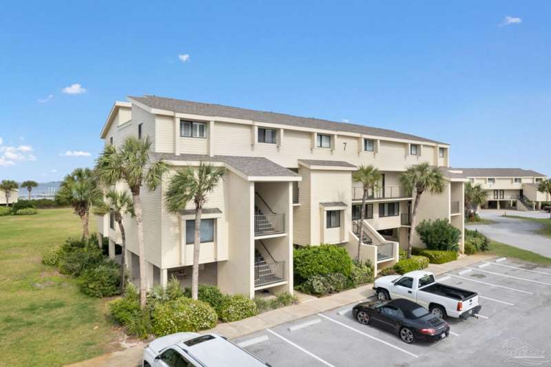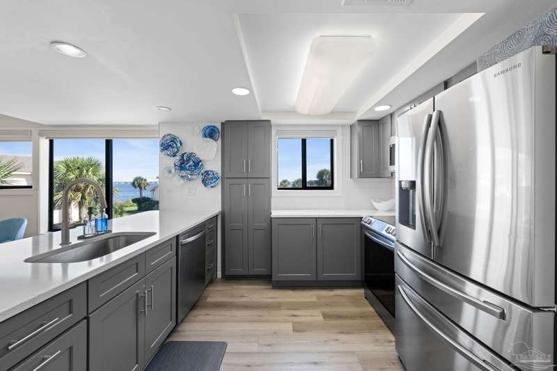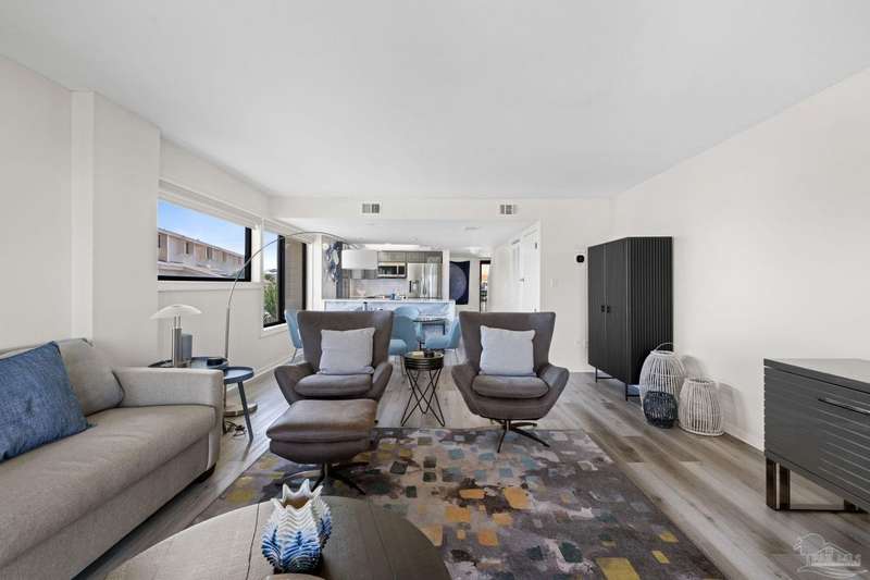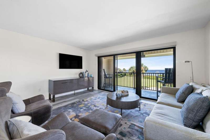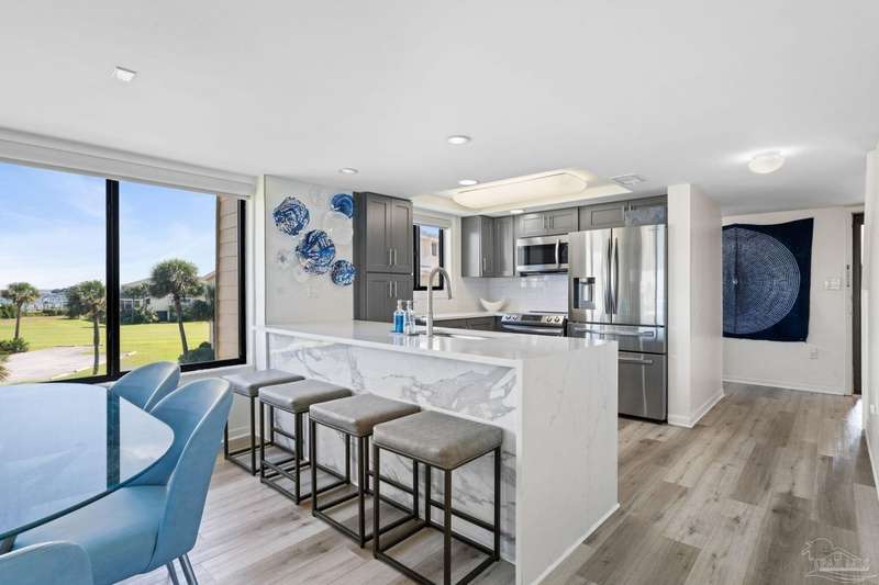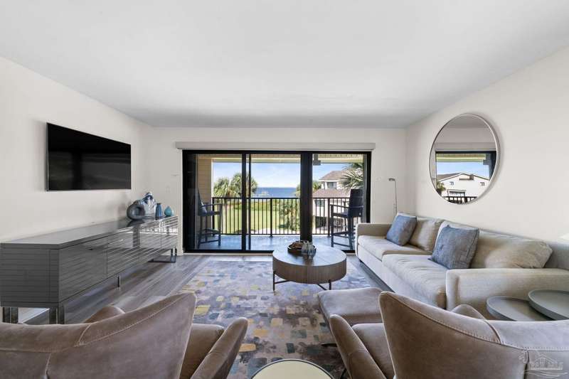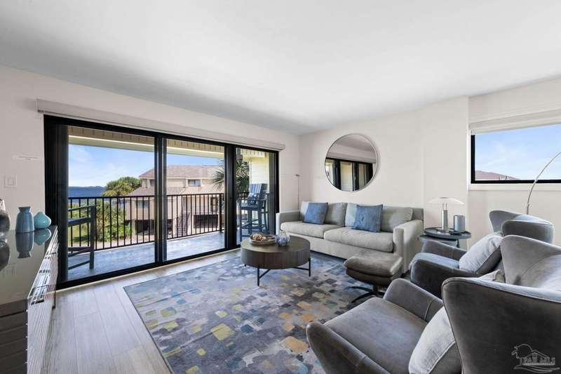 Welcome to your beachside escape at Santa Rosa Dunes on Pensacola Beach, where this fully remodeled 2-bedroom, 2-bathroom waterfront condo offers an unparalleled blend of luxury, comfort, and coastal charm. Perfectly positioned along the serene Santa Rosa Sound, this property captures breathtaking water views and vibrant sunsets, creating an idyllic setting for a primary residence, vacation getaway, or lucrative investment opportunity. Step inside to discover an updated interior featuring durable luxury vinyl plank (LVP) flooring, am expanded kitchen equipped with sleek stainless steel appliances, quartz countertops, and custom cabinetry, complemented by modern lighting fixtures that enhance the contemporary ambiance. The open-concept living area seamlessly connects to a private balcony, perfect for savoring morning coffee or evening cocktails while soaking in the Sound views. Residents of this exclusive community enjoy access to an array of resort-style amenities, including the largest pool on Pensacola Beach, ideal for refreshing swims or lounging under the sun, a fitness center, and well-maintained tennis courts for active lifestyles. For water enthusiasts, the property offers a community dock with mooring balls, making it a haven for boating enthusiasts eager to explore the Gulf Coast waters. With direct beach access just steps from your door, this move-in-ready condo promises a lifestyle of relaxation and recreation, blending coastal elegance with unmatched community features. Whether you're seeking a permanent seaside retreat or a high-demand rental property, this Santa Rosa Dunes condo delivers the ultimate Gulf Coast experience.