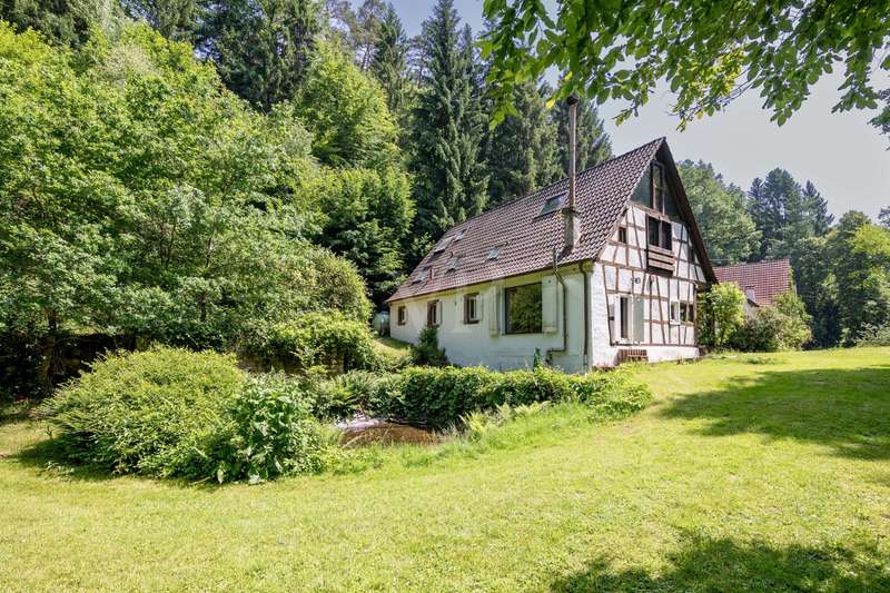 VON POLL IMMOBILIEN Zweibrücken presents this former mill property in the Southwest Palatinate. Surrounded by unspoiled nature, this charming 19th century mill estate, which is not a listed building, is a real retreat for artists, those seeking peace and quiet or self-caterers. The property consists of a lovingly renovated half-timbered house, a former barn with a gallery and studio, a bakehouse and a disused distillery. The property has been family-owned since it was purchased in 1960. Numerous renovation measures have been carried out in the main house in line with requirements. Highlights: modern gas condensing boiler, wood-burning stove, electrics renewed (2009), own water supply with 25 m well (pump new 2021), new roofing on the outbuilding (2006), second liquid gas tank for the studio allows the installation of another heating system and much more. Almost secluded location in Hirschalbtal, accessible via private roads, approx. 20 min. to Kaiserslautern, approx. 60 min. to Frankfurt or Karlsruhe. The ideal retreat with nature, peace and creative freedom! We will be happy to answer your initial questions in advance by telephone on 0 63 32 - 90 57 477 or in our store at Homburger Straße 40 in Zweibrücken or send you the detailed exposé by e-mail.