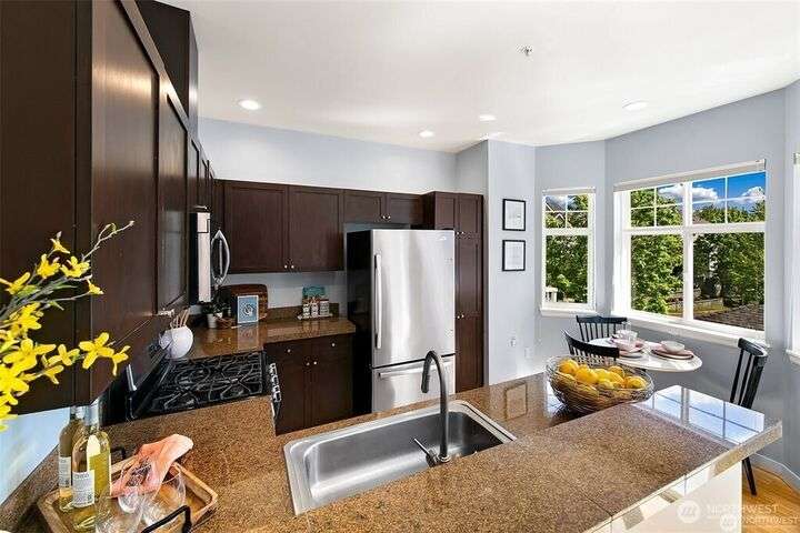 Beautiful and spacious 2-bedroom, 2.5-bath townhouse in the Cheswick Lane Community. Updated throughout with an open floor plan, large living room with gas fireplace and 9 ft ceilings, and a gourmet kitchen with granite counters, SS appliances, and an eating nook. Dining area opens to a south-facing deck with bamboo floors on the main level. Upstairs are two primary ensuites with updated baths. Lower level has a bonus room that could be used as a bedroom, storage and access to a huge 2 car garage!!! New furnace, central AC, and close to Lake Washington schools, shopping, parks, and future Redmond light rail. Terms: First, last, and deposit; 12+ month lease; no pets; no smoking; 730+ credit; 3:1 income; renters insurance required.