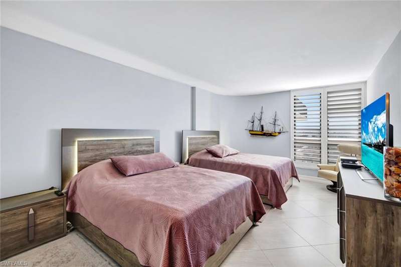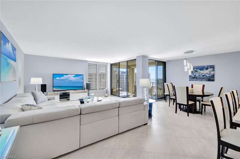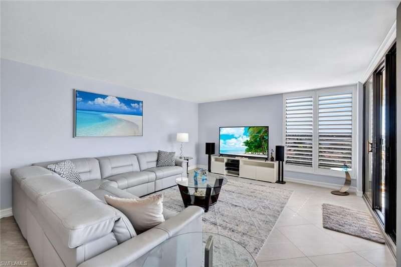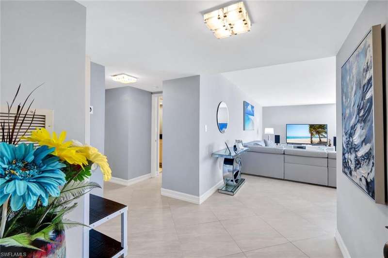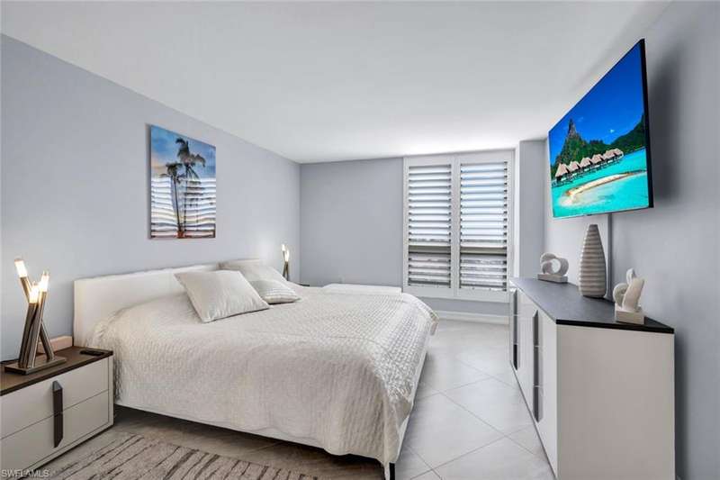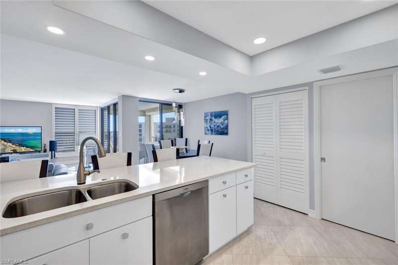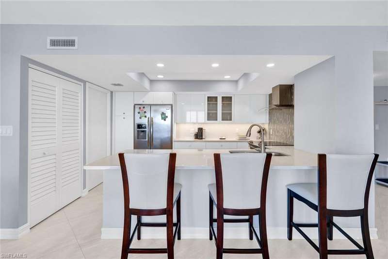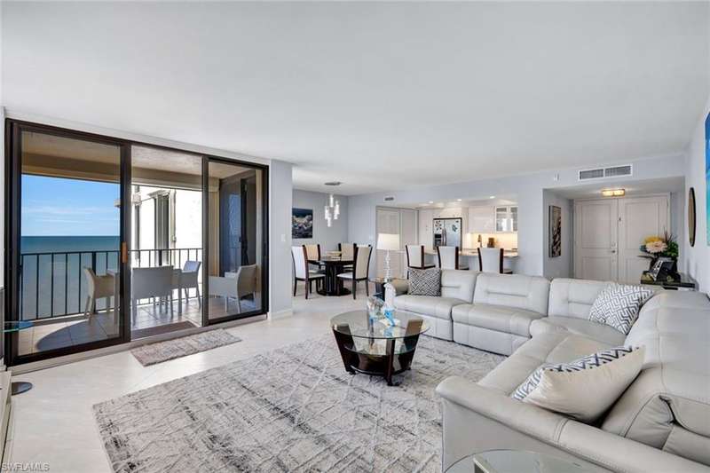 Experience the epitome of beachfront luxury in this two-bedroom, two-and-a-half-bath residence boasting breathtaking panoramic views of both the Gulf and Bay. The open floor plan and contemporary interior showcase a recent high-end renovation, featuring a sleek, gourmet kitchen with top-of-the-line appliances. Revel in the modern elegance of this sleek and comfortable residence. Relax by the beach front pool or enjoy evenings around the firepit with friends. You can walk right onto the beach from the pool area. The lobby has been recently refurbished and is incredibly inviting. No expenses were spared on renovating this beautiful, modern, clean, bright and comfortable condo. The residence offers covered parking (2 spots), extra storage, in-suite laundry, and a beachfront screened-in lanai with SW exposure for enjoying the most beautiful sunsets over the Gulf of Mexico. Conveniently located near Venetian Village for upscale dining and shopping, as well as downtown Naples and Third Stree