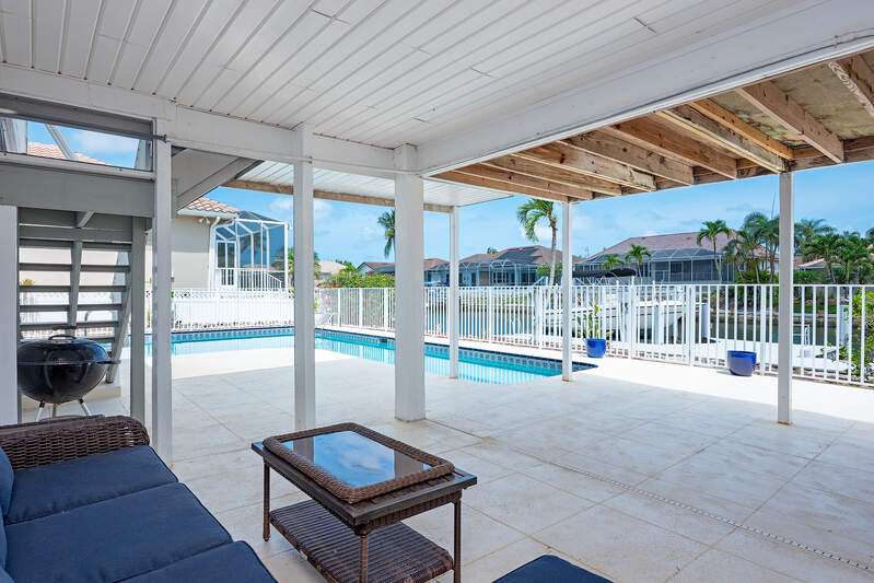 Welcome to your dream retreat in this charming Old Florida-style home, perfectly situated with indirect Gulf access. The expansive dock features both a boat lift and a jet ski lift, making it a water lover's paradise.As you enter through the generous lower foyer, you're greeted by a wide staircase leading to the main living area. The enormous living and dining room is filled with natural light from skylights and offers sliding doors that open to a delightful front screened balcony, perfect for enjoying the coastal breeze.The updated kitchen boasts elegant granite countertops and an abundance of cabinetry, including a built-in wine rack, making it a chef's delight. Adjacent is a tiled family room, adorned with ample windows and sliders that lead to the serene rear screened balcony.This home features a thoughtful split-bedroom floor plan, with cozy, carpeted bedrooms for ultimate privacy. The lower level provides two versatile bonus rooms-ideal for a workshop, hobby space, or extra storage. Step outside to the expansive shady lanai, perfect for relaxation, and enjoy the fenced pool area, offering plenty of space for sunbathing.The oversized garage provides ample room for your vehicle, toys, or additional storage needs. Located just a short distance from pristine white sandy beaches, shops, and dining, this home offers the ideal blend of comfort and coastal living. Don't miss your opportunity to experience this exceptional property!