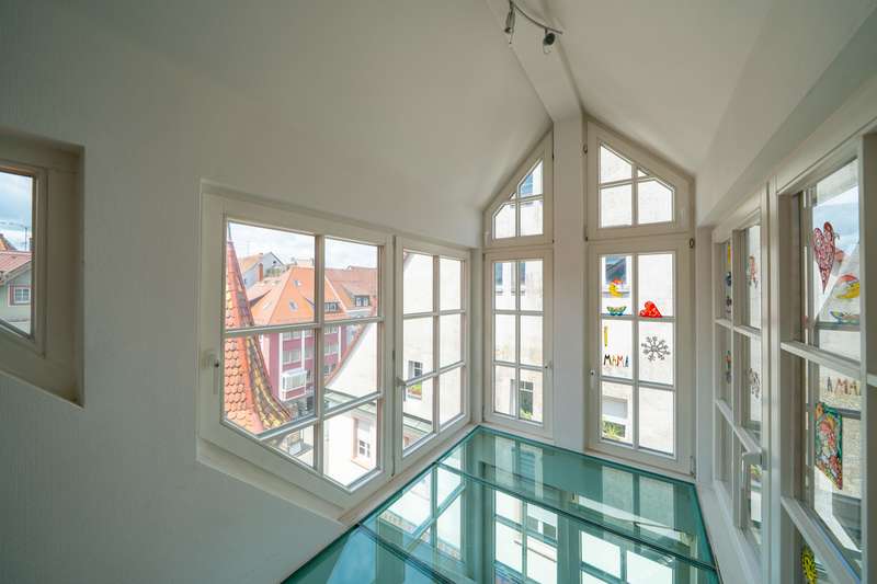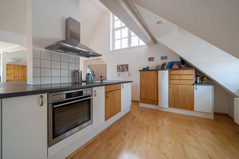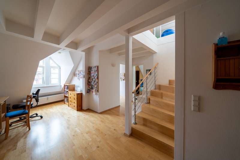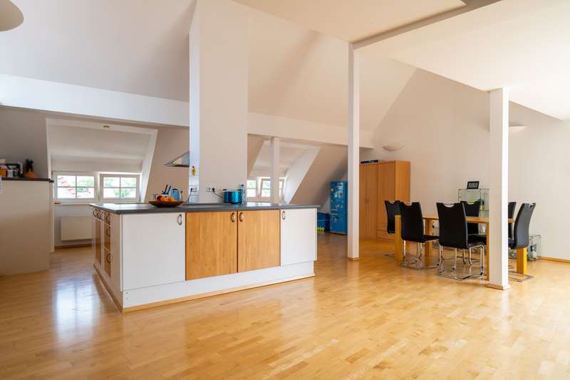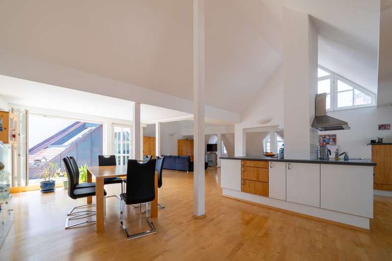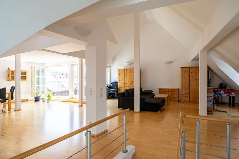 This exceptional maisonette apartment with approx. 185 m² of living space is located on the top floors of a well-kept multi-party house in a central downtown location in Villingen. The apartment offers 3.5 rooms and is ideal for couples or small families who appreciate a spacious, bright living ambience. On the lower floor of the maisonette apartment there are two bedrooms, a walk-in closet, an office niche and a storage room with washing machine connection as well as the modern bathroom with integrated sauna - your private wellness oasis. The upper loft impresses with a spacious living and dining area with an open floor plan, a large cooking island, high-quality parquet flooring and a fully glazed dormer window, which creates a special feeling of space. A balcony with a view over the rooftops of Villingen, a cellar room and an elevator in the building round off the offer. The apartment was furnished to a high standard during the last comprehensive modernization in 2000 and is heated by gas central heating. In the immediate vicinity you will find numerous shopping facilities, restaurants and cultural attractions - pure city life. Prospective tenants are cordially invited to arrange a viewing appointment. Your VON POLL IMMOBILIEN Team Villingen-Schwenningen