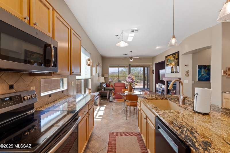 Views! Views! Views! This home in the small enclave of Rancho Vistoso, called Vista Mirabella rests against the 27 mile Wash and offers wonderful views of the Tortolita Mountain Range off the back and views of the Catalina Mountains from the front. This wonderful location is close to Oro Valley Hospital, shopping, restaurants, the OV bike loop and the wildlife underpass. Home features 4 bed/2 bath with formal living/dining, plus amazing upgraded kitchen open to family room. Light and bright kitchen features maple cabinets, large island with sit up bar, granite counters, granite composite sink, stainless steel appliances, custom tile backsplash and tons of storage space. Family room with gas fireplace, Italian porcelain tile flooring and large window/slider bringing the views indoors.