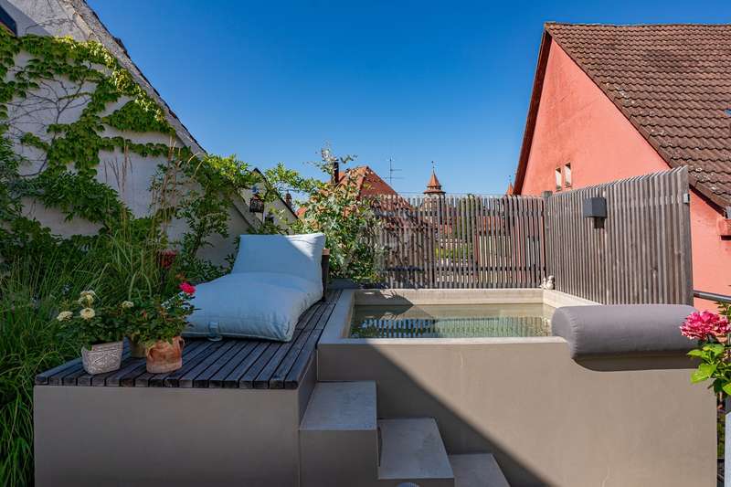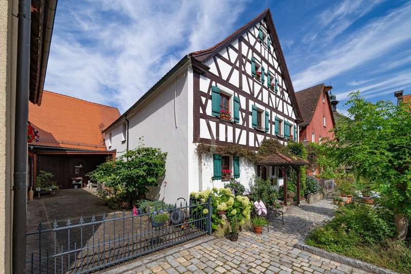 This historic gem will inspire you! This property is a special and rare building, especially due to its central location and imposing appearance! The charming, completely renovated old town house was built in the second half of the 18th century. It is surrounded by pleasant neighborhoods close to the center in the quiet part of Lichtenau's old town. With respect for the centuries-old substance of the historic building, the owners have expertly and carefully adapted the imposing building to today's contemporary living requirements through continuous modernization. The balancing act between past and present has been charmingly successful. The uniquely beautiful property impresses with its extravagant exterior and elegant interior, with a perfect exterior and interior ambience. With approx. 250 m² of living space spread over four levels, the listed old town house offers exceptional living pleasure. After entering through the front door, made of solid wood with a glass insert, you reach all upper floors via the central staircase. On the first floor to the left is an eat-in kitchen with a functional fitted kitchen, to the left a living room, a bedroom and a bathroom. Along the corridor at the rear of the house you have storage space, an exit to the barn with a small terrace, a laundry room and a further shower room. You can park your vehicles in the directly adjacent outbuilding, which serves as a large garage. This means you can always enter the house with dry feet. The upper floor impresses with an open kitchen and a spacious family dining area. The modern fitted kitchen impresses with brand-name electrical appliances and leaves nothing to be desired. Also on this level are the study, a children's room and the recently modernized bathroom with underfloor heating, Hoesch bathtub, walk-in shower, vanity unit and indirect lighting. The large hallway leads to the huge terrace. In the summer months, this becomes your very own private relaxation and wellness area with the designer whirlpool, as you are completely protected from prying eyes. The terrace is located between the house, barn and garage building with a magnificent view of the castle towers and the old town. The very spacious living area on the top floor is the focal point of your new home and is very well lit on three sides thanks to the many windows. The open fire spreads a cozy atmosphere and pleasant warmth in the winter months. There is also a small storage room for firewood and another WC. The rustic ceiling beams and the partially exposed half-timbering contribute to the cozy living ambience. Another special highlight is the covered balcony with a great view of the terrace. The elegant staircase takes you to your own private retreat, the bedroom with dressing room, all custom-made and perfectly coordinated. This property will inspire you. See this gem for yourself on site. We would be happy to arrange a personal viewing appointment if you are seriously interested. Please send us a fully completed contact request with your telephone number by e-mail. We look forward to hearing from you.