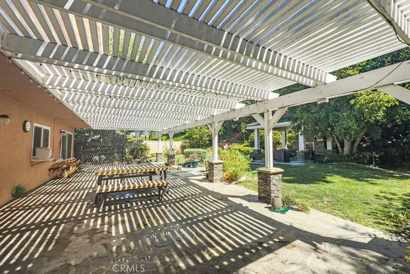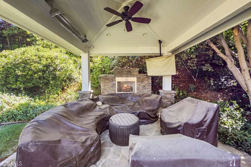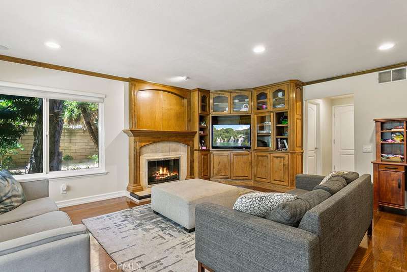 Open to the kitchen, the spacious family room is warm and inviting with matching pecan cabinetry, rich wood flooring, a stone fireplace, and recessed lighting. A sliding glass door extends the living space outdoors to a truly one-of-a-kind backyard retreat. Designed for year-round entertaining, it boasts exquisite hardscape, lush greenery, detailed stonework, and a large covered gazebo complete with an outdoor fireplace and TV.