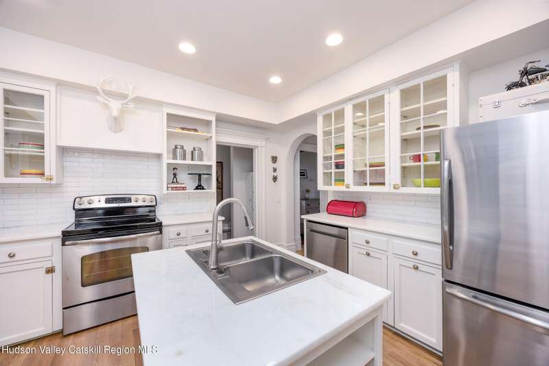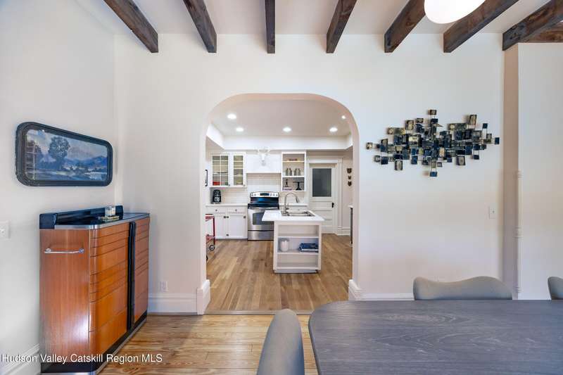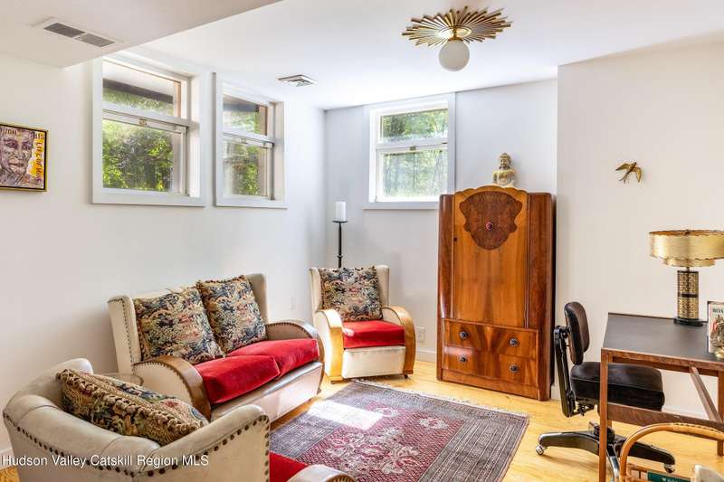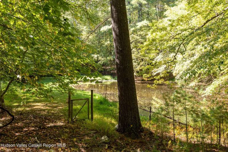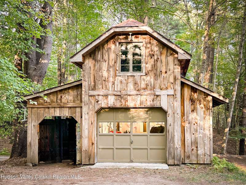 Quintessential Woodstock Contemporary tucked away on almost 4 bucolic, private acres minutes to the center of town. Perched at the end of a dead end lane on one of the areas loveliest roads is this 2 bedroom 1.5 bath home with extra flex space to expand. It is all in the details that makes this home such a delight. Hardwood floors and hand-hewn beams throughout create a timeless backdrop, Open-concept living room/ dining room with large windows bringing the natural surroundings in. Arched doorways and a sweet sitting alcove off the dining area add character and charm. Kitchen has solid wood/glass mullioned cabinets, marble countertops and stainless steel appliances offering the perfect blend of modern and retro. Half bath off the kitchen with ample room to expand off the mudroom if desired. Upper level has two gracious bedrooms and bathroom with space to reconfigure if you wish. Lower floor flex room with gracious laundry room ideal to add another full bathroom. This home is sweet just as it is but has space to be reimagined. The surrounding land is completely private, surrounded by old growth pines and open, sunny clearings perfect for a pool. Inviting gazebo overlooking neighboring spring fed pond for al fresco dining and taking in the natural, Catskill Mountain beauty. Detached, two-level 300 sq ft garage is currently being used as an art studio but could be converted to an all season office, studio, or an ADU. Per the Town rules as it is 3 acre zoning, this property is compatible with an additional living space being permitted. Whether you convert garage or build another structure, it is rare to have the acreage allowable for a legal ADU. Property abuts neighboring Angus Lane. There is ample space on the property to build an ADU to maintain autonomy for both homes or using existing garage to create a compound feel. This ideally located property is steps to Woodstock's best walking road to the majestic Cooper Lake, a few minute drive to the center of Woodstock to tap into all the creative community has to offer and a perfect base for all things in he Hudson Valley. Catch a. show at Levon's Barn or the Bearsville Theater and The Colony, have a great meal at Oriole 9, Silvia, Red Onion or one of the many eateries in town, walk the historic Byrdcliffe Arts Colony that still hosts artist residences every summer. The expansive Rail Trail and extensive hiking trails are all a stone's throw away. This property is under 30 minutes to Belleayre Ski area, Inness Resort and Arrowood Brewery, offering an outdoor venue with shows and festivals all summer. Wander Kingston's Stockade District with its lovely architecture, galleries, shops and eateries. Head to Camp Kingston for lunch, coffee, pinball and collective workspace, Rough Draft for books, libations and a cozy workspace and Rosies on the waterfront for eclectic eats. The UPAC offers a. historic venue with world- renowned shows all year round and the Hutton Brickyards has been reimagined into a beautiful, outdoor venue that hosts Field + Supply, music and arts festivals with Kingston's Greenline walking trail and over 500 acres of protected land by the Hudson River. This home offers the perfect balance of a serene upstate getaway yet close to all the Hudson Valley has to offer. It is rare to find such a private, quiet setting minutes to everything. A home ready to enjoy and begin to create your own Catskill retreat.