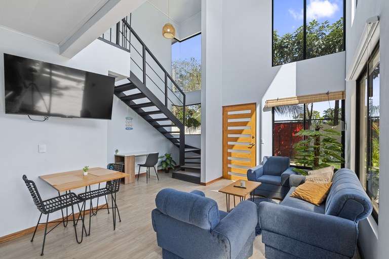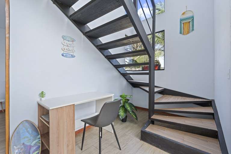 The spacious main house features two bedrooms and two bathrooms with an open-concept design, high ceilings, and large windows that fill the space with natural light. Enjoy your morning coffee from the expansive upstairs terrace or balcony overlooking the surrounding nature, or relax by the private pool surrounded by lush tropical gardens.