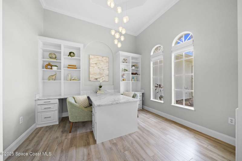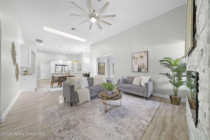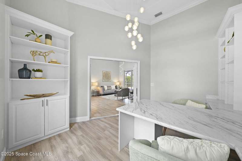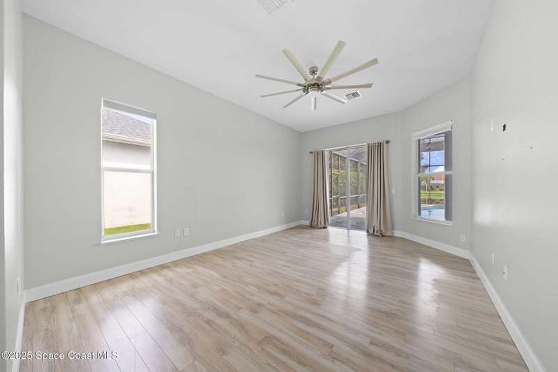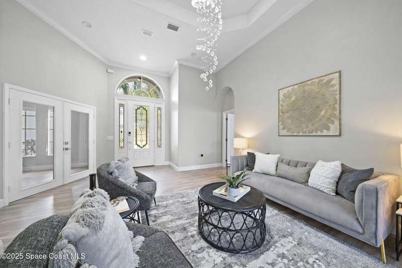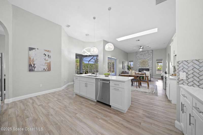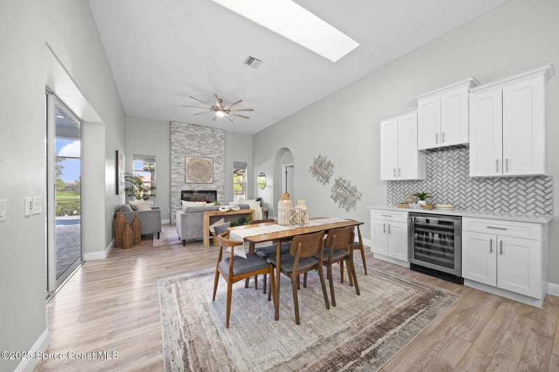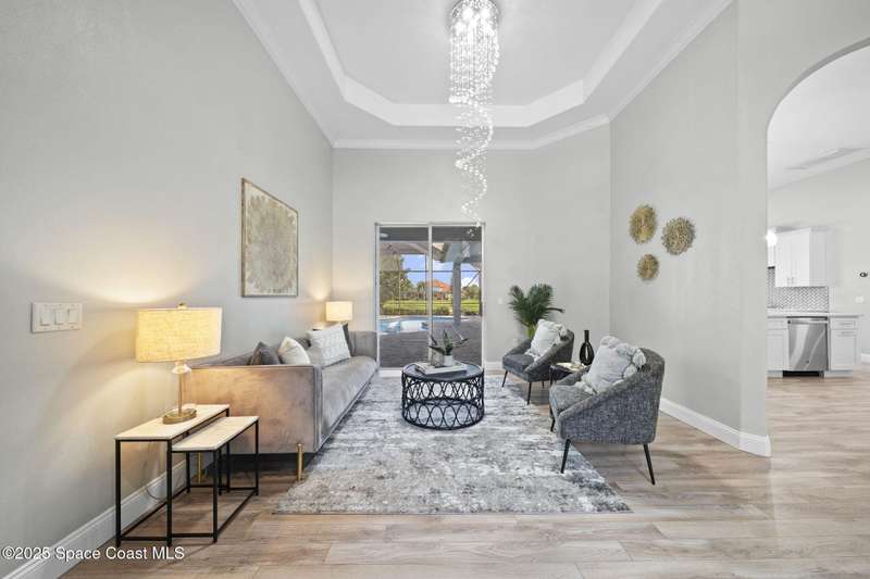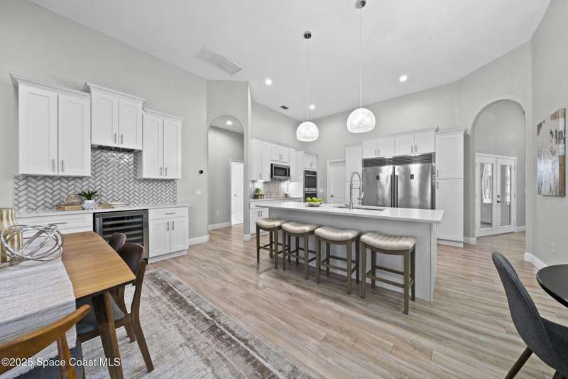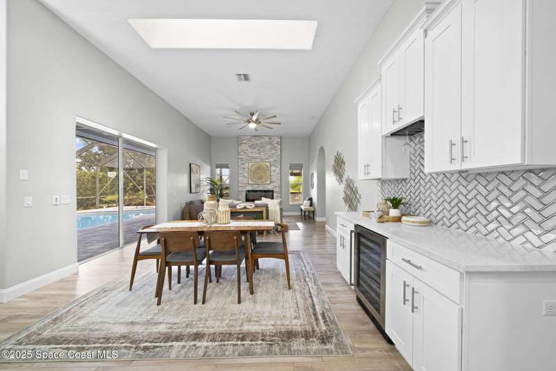 Nestled in a desirable, family-friendly neighborhood within Salerno Village's exclusive Ravencliff enclave, this custom 4-bedroom, 3-bath plus office home blends elegance and comfort with seamless indoor-outdoor living and peaceful lake views. The gourmet kitchen features quartz countertops, stainless appliances, double ovens, and a commercial-grade refrigerator, complemented by a wine bar with fridge. Expansive sliding glass doors open to a screened patio with a sparkling freeform pool and full summer kitchen overlooking the water. The luxurious owner's suite includes dual walk-in closets and a spa-inspired bath with soaking tub and oversized shower. Residents enjoy resort-style amenities including a swim club with Olympic-size pool, tennis and basketball courts, playground, pavilions, and scenic trails. Move-in ready, this home offers the perfect balance of relaxation and entertainment.