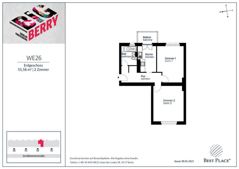 Your investment in the centre of trendy Kreuzberg: with this efficiently designed 2-room flat, you are investing where young people, professionals and families want to live. The flat with approx. 56 m² is located on the ground floor of the six-storey residential building. It has a lovely balcony facing east towards the inner garden courtyard. The bathtub in the bathroom provides a wellness feeling. The practical layout and size of the flat make it ideal for singles or couples. Our sought-after investment project Big Berry offers investors solid rented flats in one of Berlin's most sought-after neighbourhoods. The six-storey residential building with four storeys was built in the 1950s and a new top floor was added in 2023. It has 76 flats with one to four rooms and approx. 26 to 108 m². A lift was added as part of the loft extension, which also benefits the existing flats. Big Berry also includes an idyllic garden courtyard and 17 car parking spaces.
