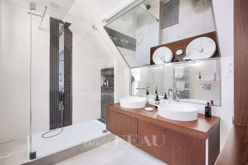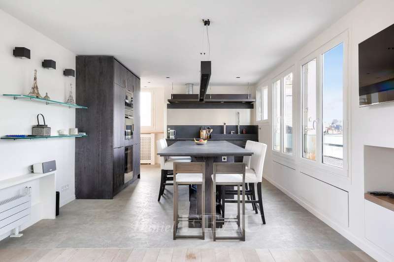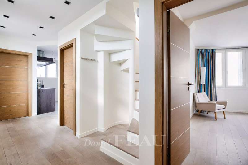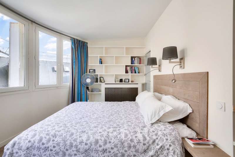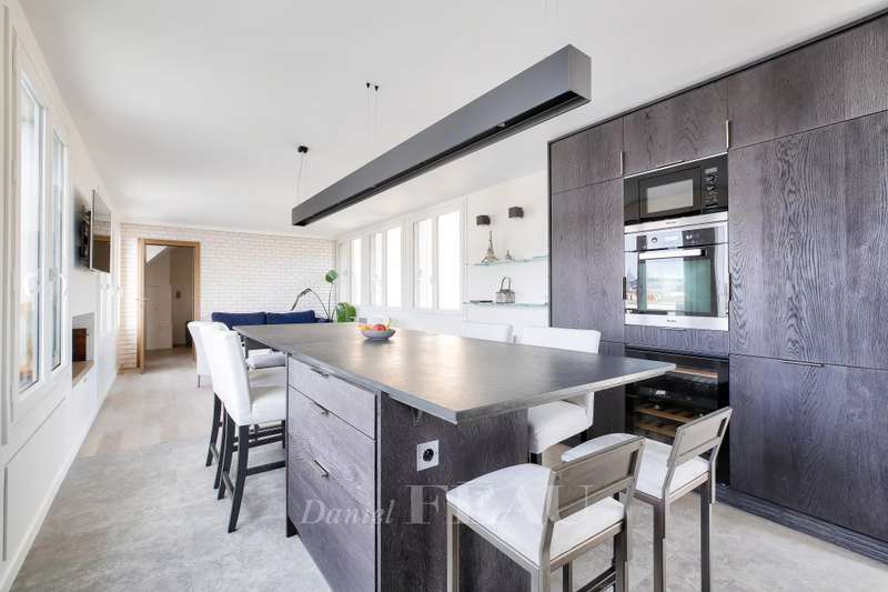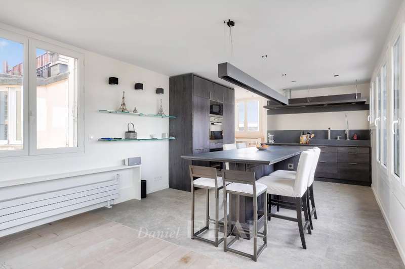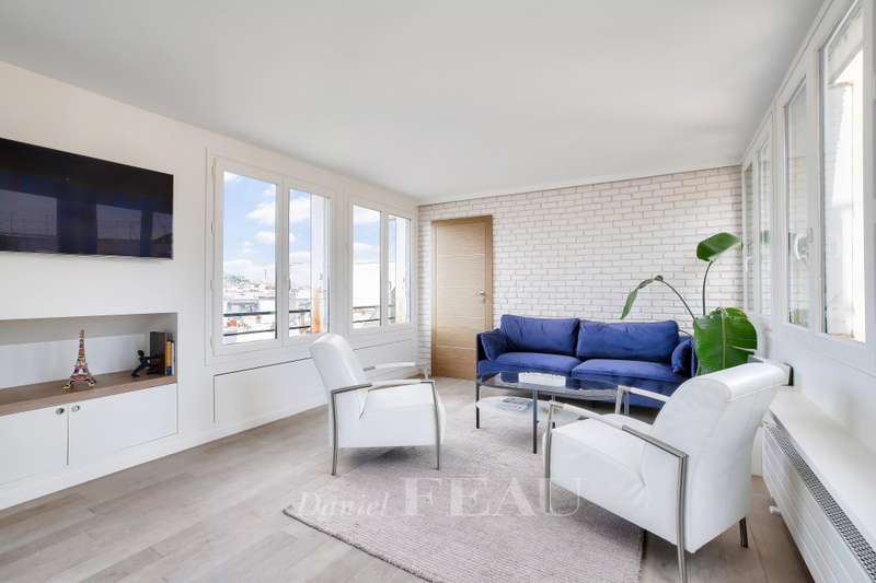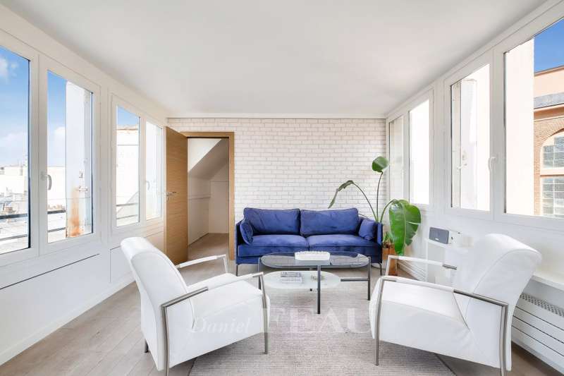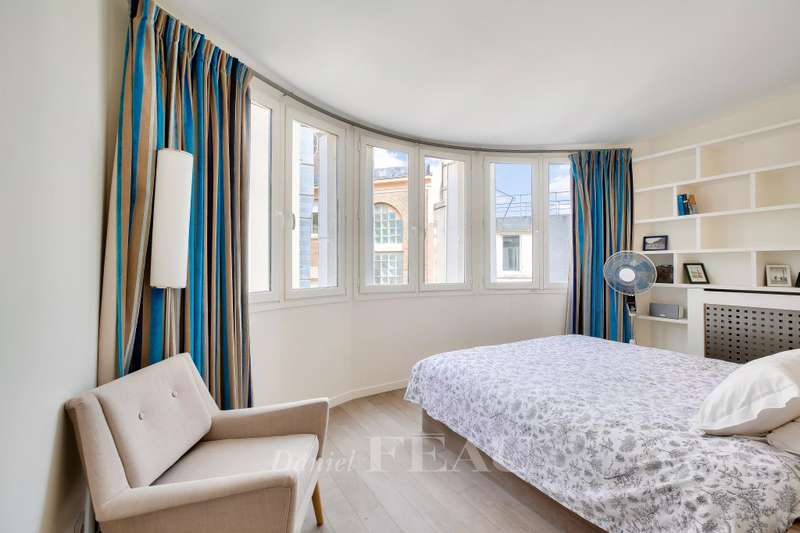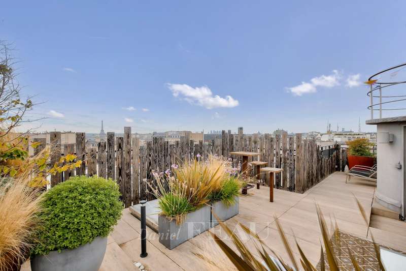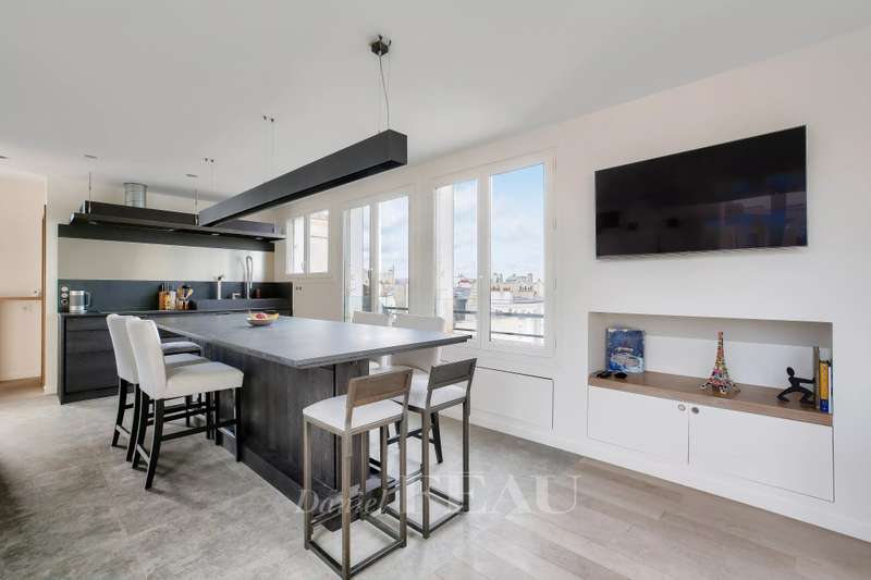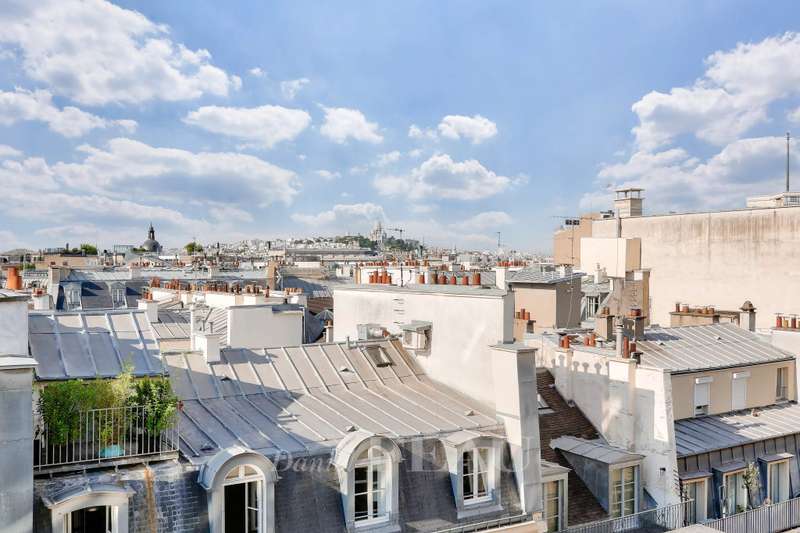 Rue du Louvre, a stone’s throw from Place des Victoires. This apartment benefiting from an over 90 sqm roof terrace is on the 7th and top floor of a fine early 20th century building with a lift accessing up to the sixth floor. Offering 97.69 sqm of floor space and 90.26 sqm of living space as defined by the Carrez Law, it includes a living/reception room bathed in sunshine and enjoying an open view over the rooftops and of Sacré Coeur Basilica, a fully fitted and equipped kitchen with dining facilities, three bedrooms (one air-conditioned), and two shower rooms. A staircase accesses the landscaped roof terrace which commands a 360° panoramic view of many of the capital’s most iconic landmarks.