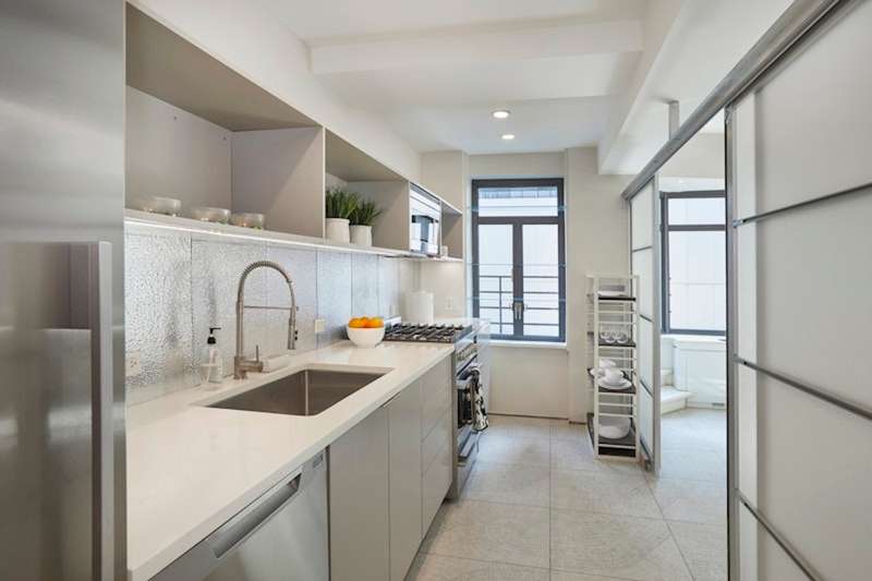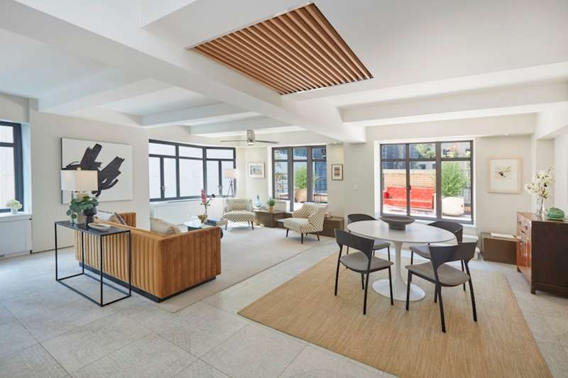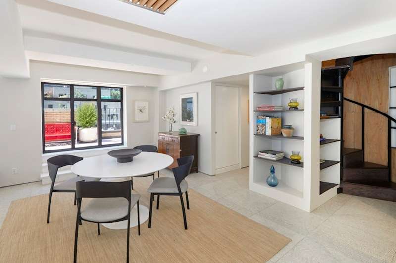 Flooded with natural light, this duplex features masses of oversized windows and two sets of French doors that lead seamlessly to the terrace. The voluminous living and dining area, coupled with an open, windowed kitchen that may be sleekly closed off with its sliding glass doors, creates an inviting atmosphere for living and entertaining. The extraordinary amount of open space was created by removing walls from the original five rooms to create a home that speaks to modern sensibilities and needs.