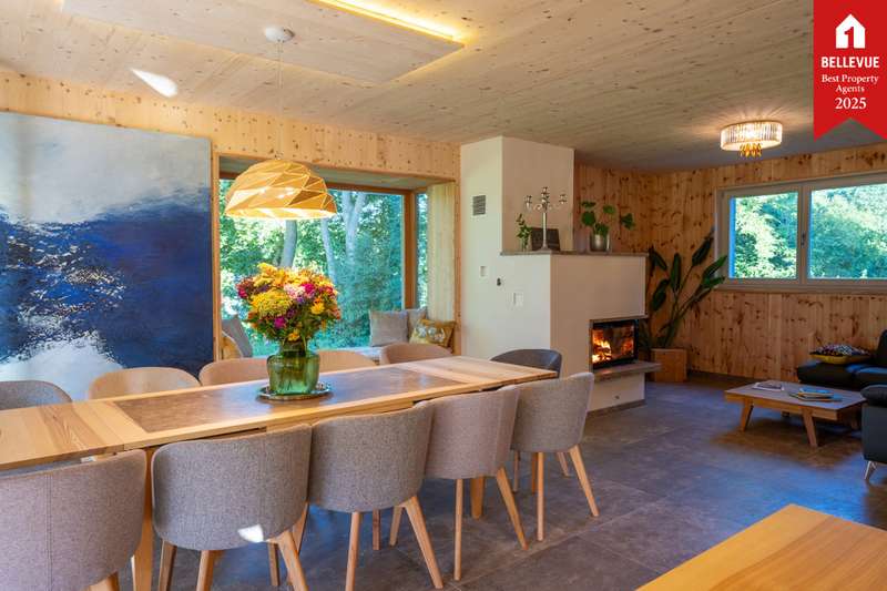 An idyllic green home with space for up to two families is for sale. The sunny and bright living rooms allow you to live your feel-good moment at home every day. The house has a beautiful winter garden, an open kitchen area, two bathrooms with bath and shower and two guest toilets. If desired, a fireplace can be installed at any time, the attic can be used as an expansion reserve and a smart home system can be installed if desired.