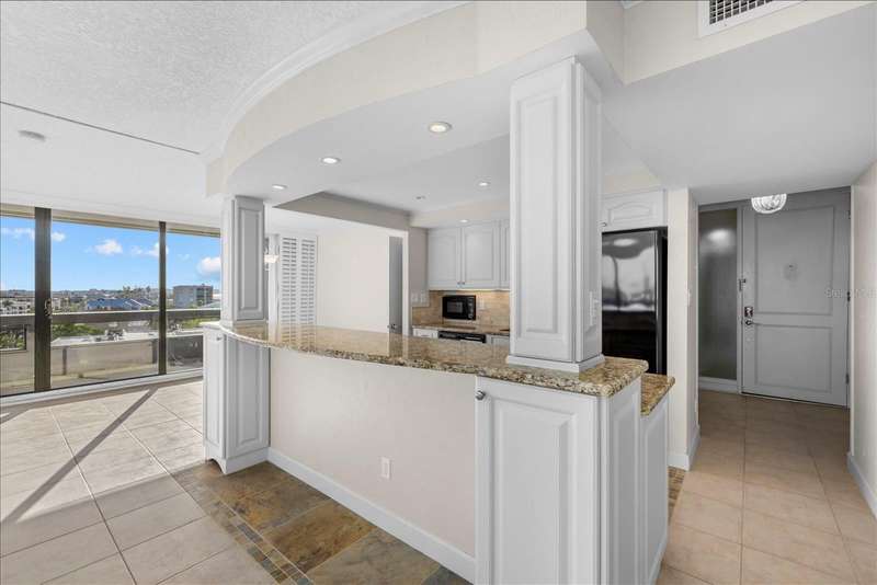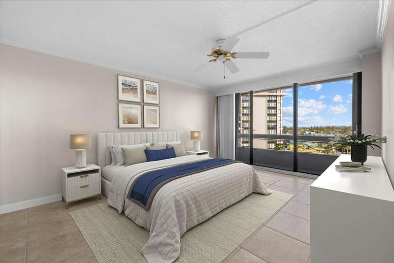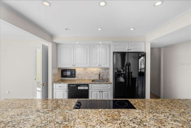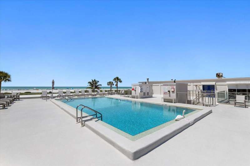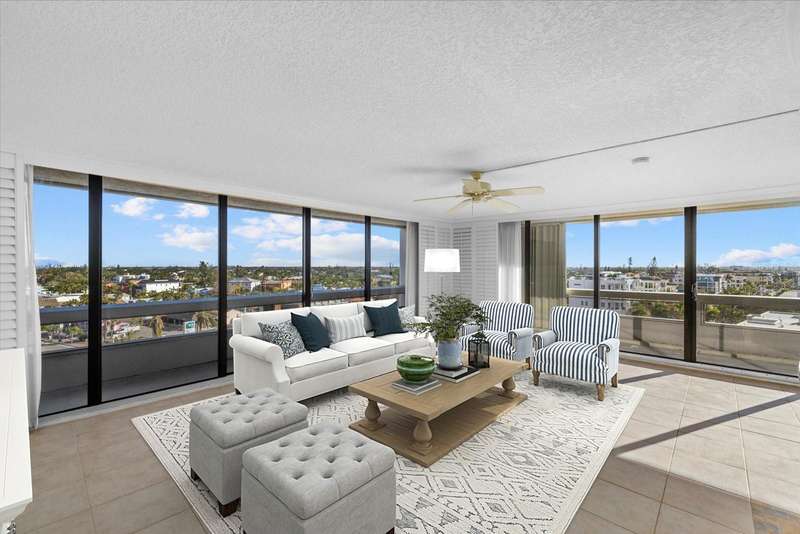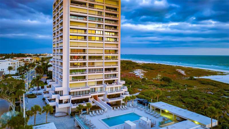 One or more photo(s) has been virtually staged. The Beach Terrace building is one of the most desirable addresses on Siesta Key with a direct Gulf of Mexico location and nestled at the end of the village. This 2 bedroom / 2 full bath corner residence offers panoramic views of the Siesta Key beach, village and aqua water of the Gulf of Mexico. The condominium offers 3 spacious balconies to enjoy morning coffee, evening sunsets and the skyline of downtown Sarasota in the distance. Enter the split floor plan residence through the entry with tiled flooring into the kitchen. The kitchen boasts updated cabinetry, appliances, lighting, granite countertops. The large living area offers dual sliders that provide expansive views throughout Siesta Key and the beach. You can enjoy just relaxing on the couch and viewing the sparkling waters of the gulf. The dining area also provides ample space for entertaining. The primary bedroom has a private balcony with views of the gulf and village. There are two full size beds and an ensuite bath and vanity area including updated tile, cabinetry and granite countertops. The second bedroom offers a full bed with an additional full sliding door for and dazzling views of the gulf. This bedroom also provides an additional bathroom with updated cabinetry, tile shower and granite. The onsite amenities include elevated heated saltwater pool, fitness center, community room all steps from private beach.