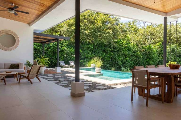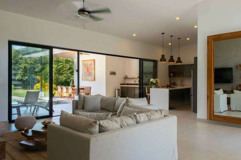 Set on a generous 4,000 m2 (1-acre) titled lot, the property is surrounded by mature native trees, lush jungle, and an abundance of local wildlife, offering both privacy and a true connection to nature. The home's architecture emphasizes clean, modern lines and open spaces, with expansive glass doors that bathe the interior in natural light and frame views of the tropical landscape.