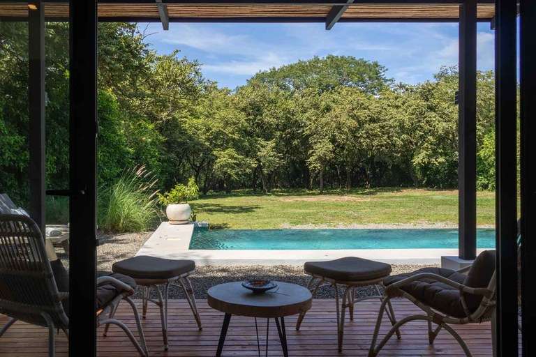 Discover Casa Bromelia Dorada, a modern 3-bedroom, 3.5-bath luxury home set within the peaceful, nature-integrated community of Finca Arwen, just minutes from Tamarindo and Playa Avellanas. Situated on a sprawling 4,000 m2 (1-acre) titled lot, this architectural gem blends clean lines, expansive glass, and high-end finishes with Costa Rica's lush tropical surroundings. Designed for seamless indoor-outdoor living, the home features an open-concept layout, a covered terrace, and a stunning stone-edged pool, all surrounded by mature jungle and abundant wildlife. With an additional 3,000 m2 of buildable land, Casa Bromelia Dorada offers rare expansion potential for a guesthouse, rental units, or subdivision—making it a perfect combination of personal sanctuary and smart investment opportunity.