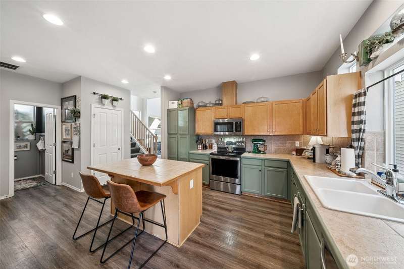 Welcome to Verona South, a gated community in desirable Lakeland Hills! This charming 3-bedroom, 2.25-bath home is filled with natural light and features an open-concept main level with stunning 20+ ft vaulted ceilings in the living and dining areas. The dream kitchen boasts a large island, plentiful cabinets, ample counter space, and stainless steel appliances—ideal for entertaining! Upstairs, you'll discover two spacious bedrooms, generous walk-in closet space, laundry, and an expansive primary suite. Enjoy a low-maintenance yard with a roomy private yard + patio. The Lakeland community offers a wealth of amenities, including parks, trails, dining, and convenient access to HWY 167 & 18, as well as the Sounder Train! Don't miss this one!