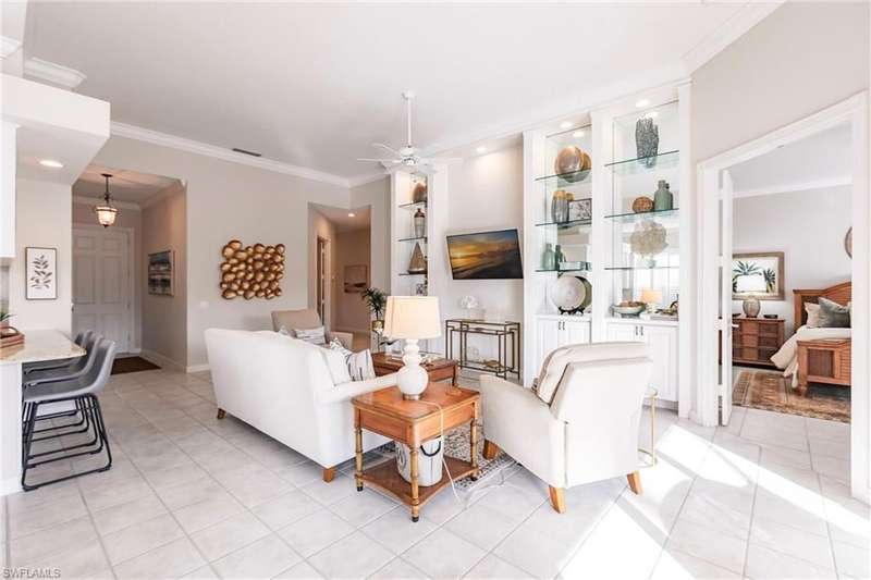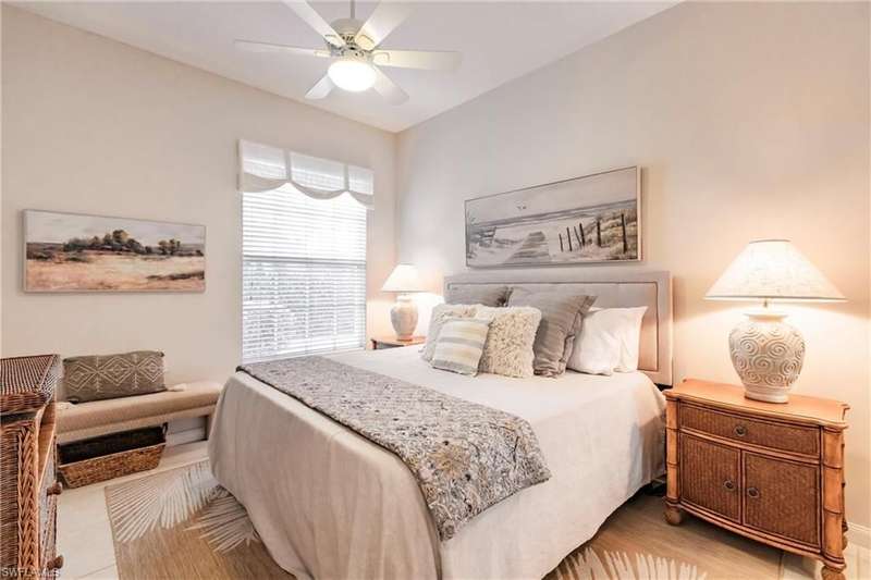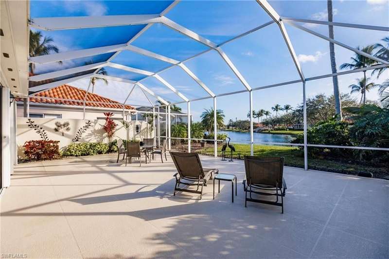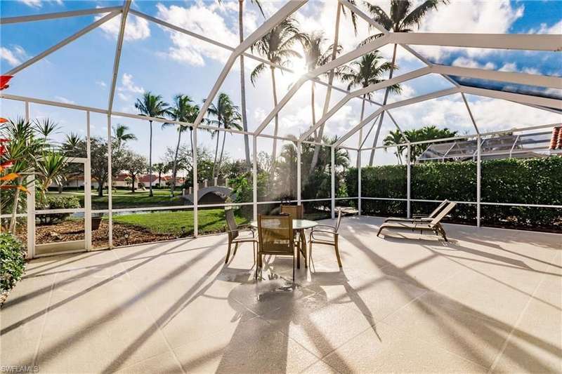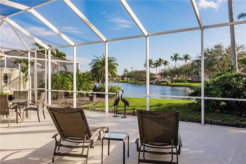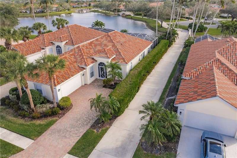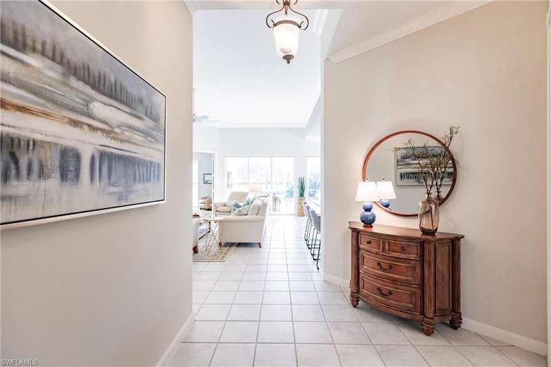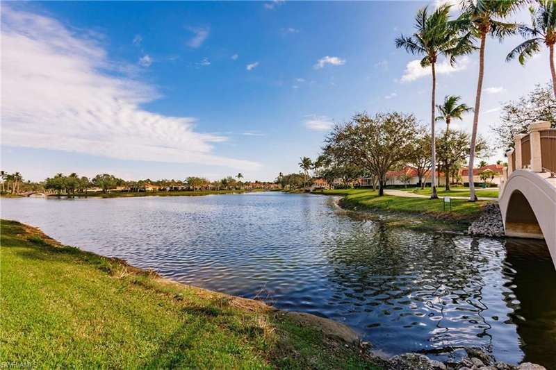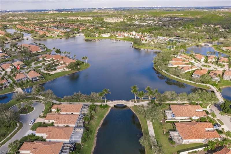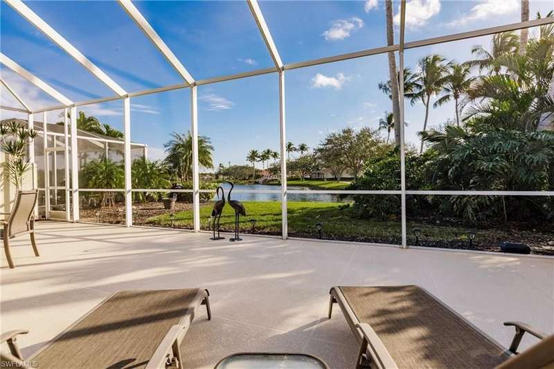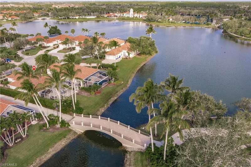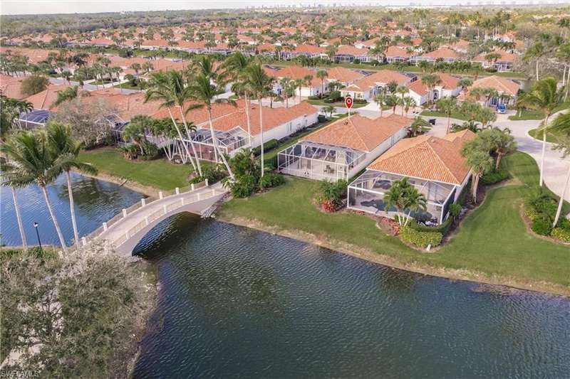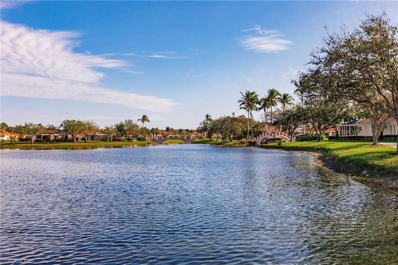 Big lake views with multiple Venetian bridges in sight. Pleasant walk to community amenities. Super clean 3 bedrooms, 2 bathrooms, den or home office, huge screened patio, and 2 car garage. Features include; 2018 roof, long brick paver driveway and sidewalks, screened front entry, modified wall unit, hurricane protection, remodeled guest bathroom, and great interior location within the community. Village Walk is 5 miles from the sugary sands of Vanderbilt Beach and 4 miles to the shopping and dining gem - Mercato! Amenities for everyone, including tennis, pickleball, bocce, gym with lap pool, restaurant with scenic patio on the large lake, 2 heated pools, and so much more! Please note this home is leased through May of 2026 and lease must be honored.