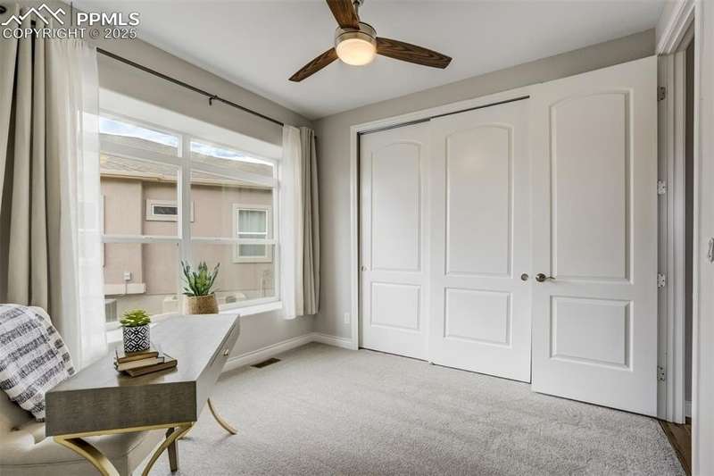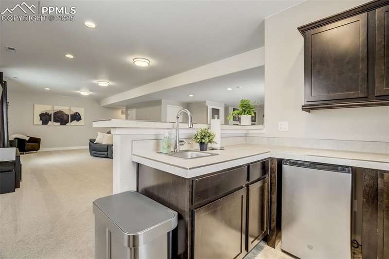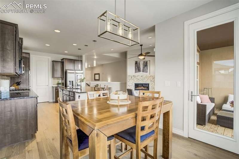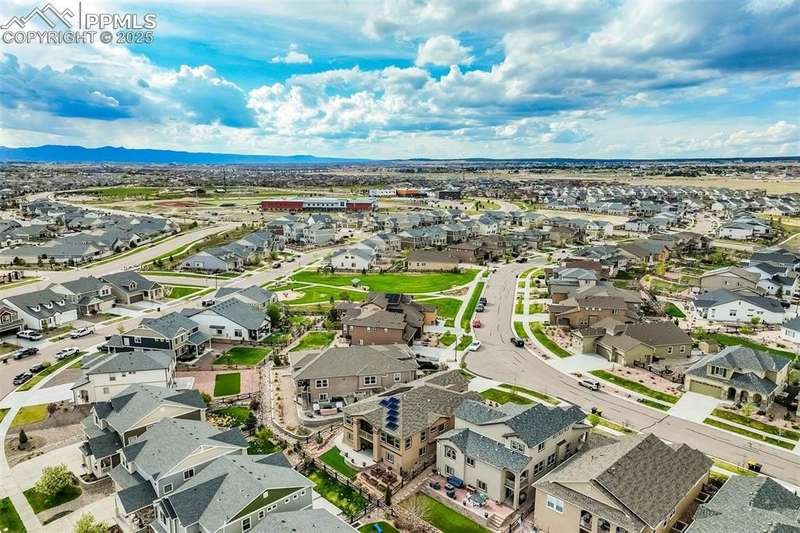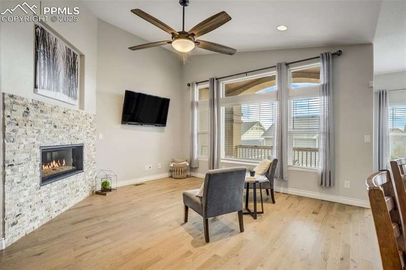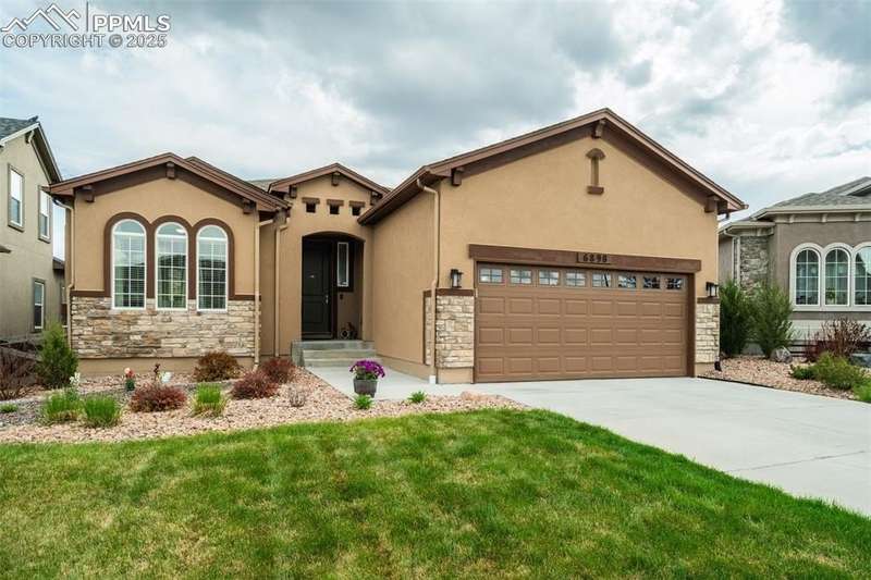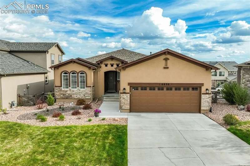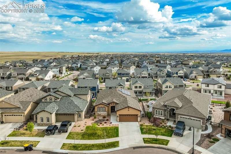 Discover the ideal combination of lifestyle and livability in this gorgeous home! Banning Lewis Ranch in Colorado Springs provides amazing amenities right in your community! This beautiful home is in immaculate condition and ready for you to move in! Picturesque windows illuminate the space with abundant natural light. Enjoy main level living with a spacious primary suite and 2 additional bedrooms and bath. An open floor plan with beautiful hardwood floors invites easy entertaining. The gourmet kitchen offers abundant cabinet and counters, gorgeous backsplash, and an oversized island with counter seating. The eat-in nook opens directly to a covered patio, ideal for grilling! A cozy fireplace with stone completes the family room perfectly! The newly completed walk-out basement with 9" ceilings provides a wonderful second living space! Enjoy a wet bar along with plenty of versatile space with above ground windows! Two additional bedrooms and bathroom, complete the space! Step into the covered back patio and notice the raised planter beds; the water feature provides a beautiful and peaceful focal point to enjoy! The solar panels are owned so you can enjoy the numerous benefits they provide!**Sellers have installed trees to help provide some privacy between neighbors Banning Lewis Ranch is known for outdoor enjoyment, community activities like concerts and farmers markets with food trucks and local vendors. There are courts for pickleball, tennis, and basketball and rec center/fitness center, pools, a splash water park, scenic walking trails, dog parks, and much more. Additionally, Banning Lewis Ranch Academy is sought after for academic excellence! The lifestyle is ideal and it also offers easy access to military installations too: 20 min Peterson SFB 30 min to Downtown Colorado Springs, COS Airport & AF Academy 40 min Schriever SFB & Fort Carson 75 min to Denver International Airport & Downtown Denver