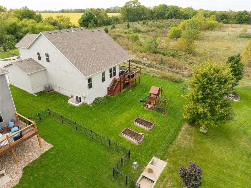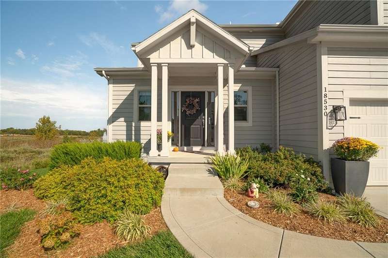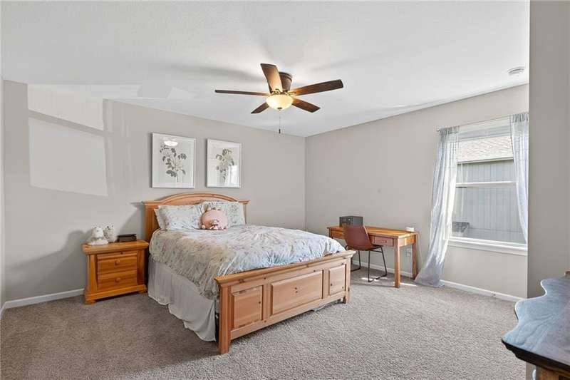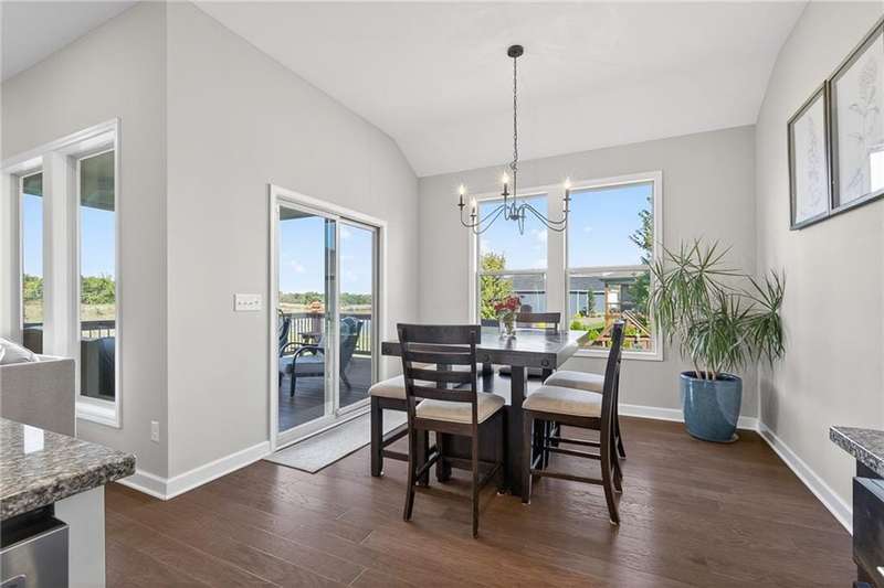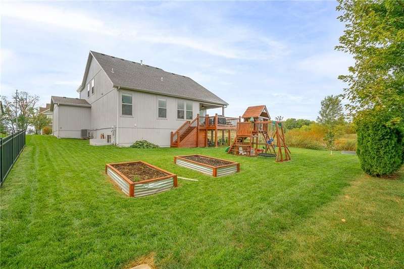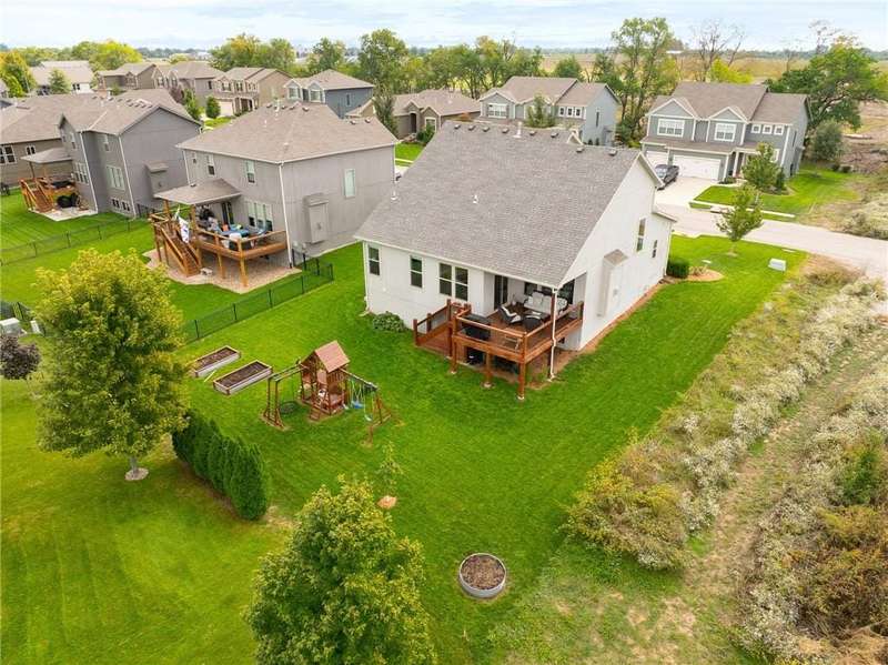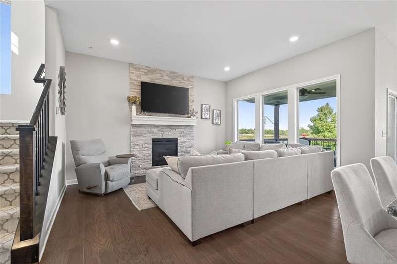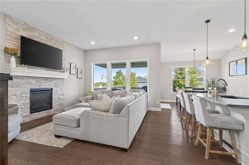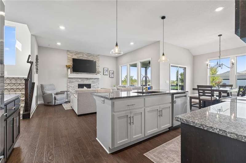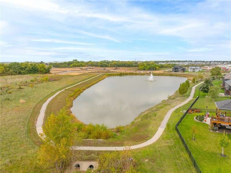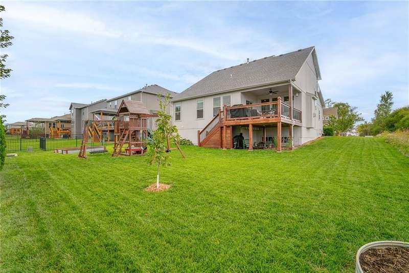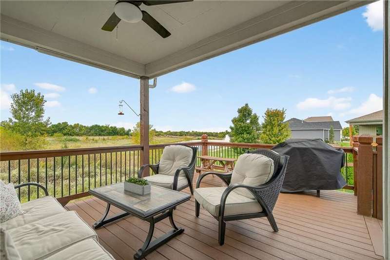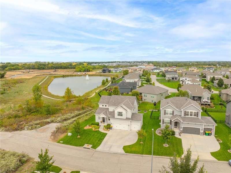 Beautiful 5 bedroom, 3.5 bath, 1.5 story home with a 3 car garage located in the highly sought after Estates of Wolf Creek,Johnson County, Spring Hill. The main floor features a spacious primary suite with vaulted ceiling, ceiling fan, walk-in closet, double vanity, tiled floor, walk-in shower, and stunning views of the pond. Three additional bedrooms are located upstairs, while the daylight finished basement offers a family room, rec room, fifth bedroom, and a third full bath. The great room boasts wood floors and a cozy stone fireplace, and outdoor living is enhanced by a deck and covered deck, perfect for enjoying pond views and breathtaking Kansas sunsets. Sprinkler System! Enjoy all the amenities this beautiful community offers, including a scenic pond, walking trails, and a neighborhood pool.