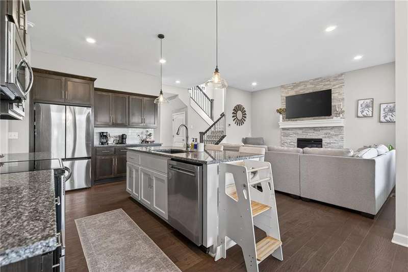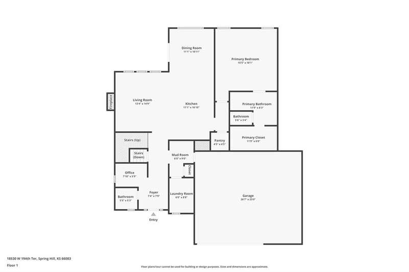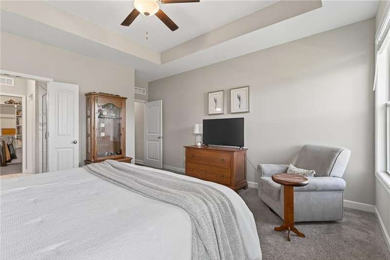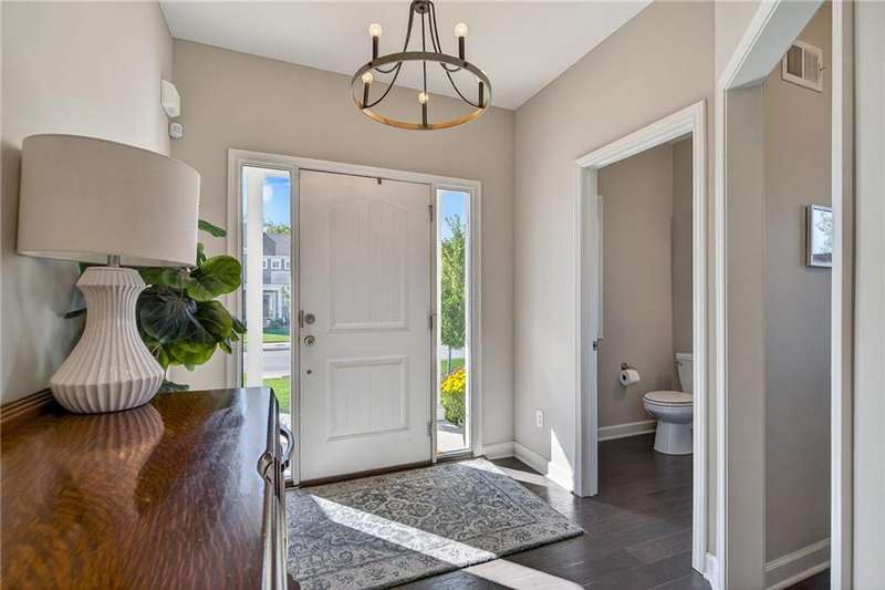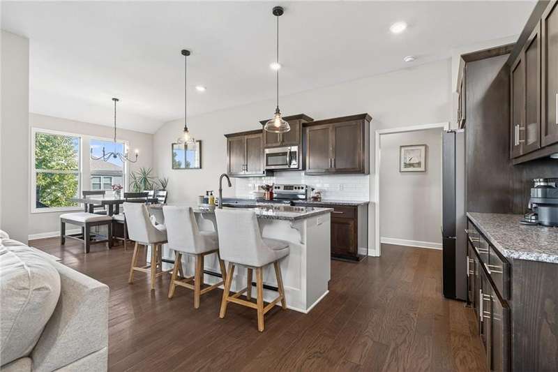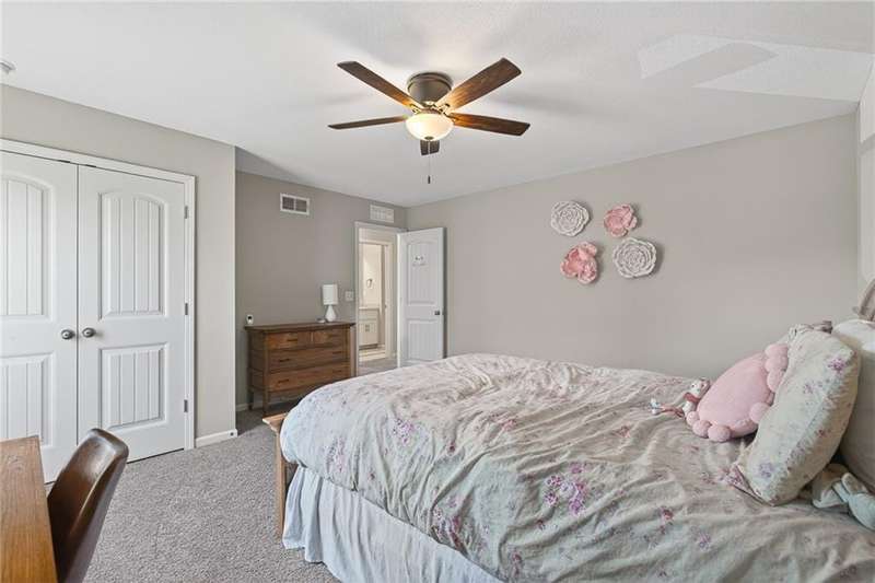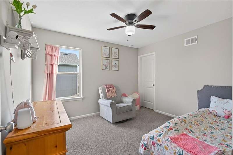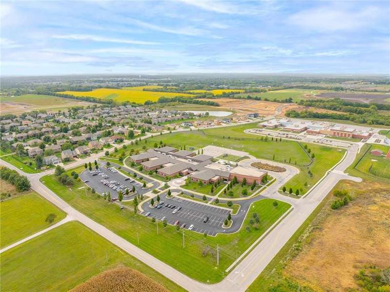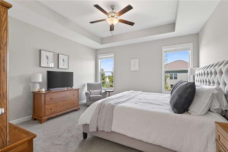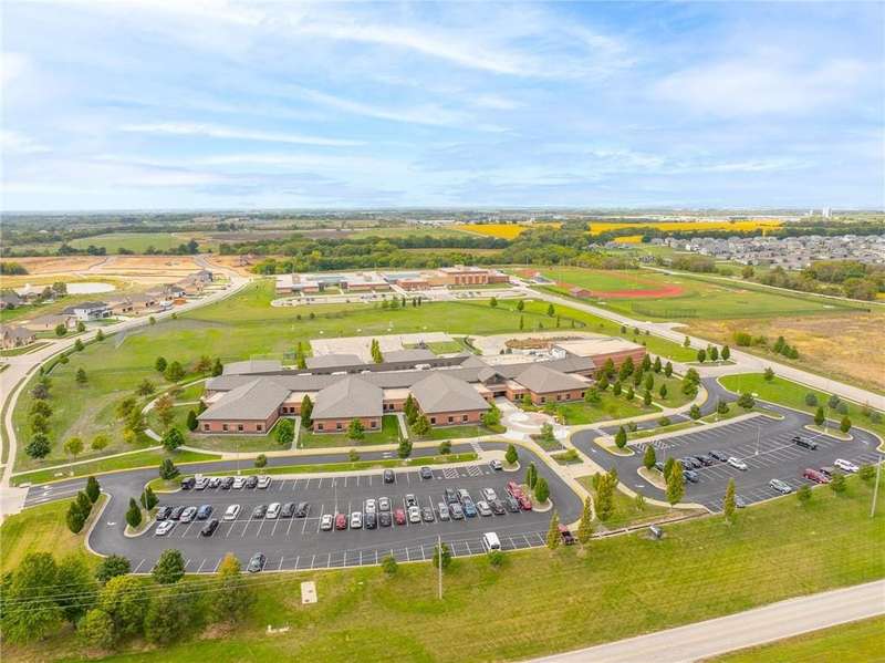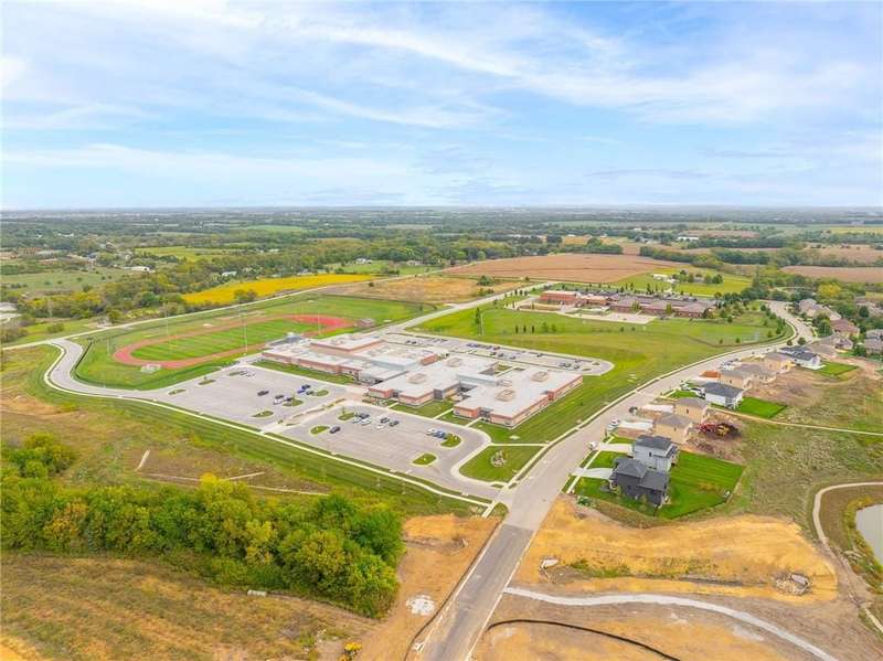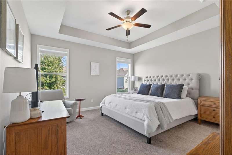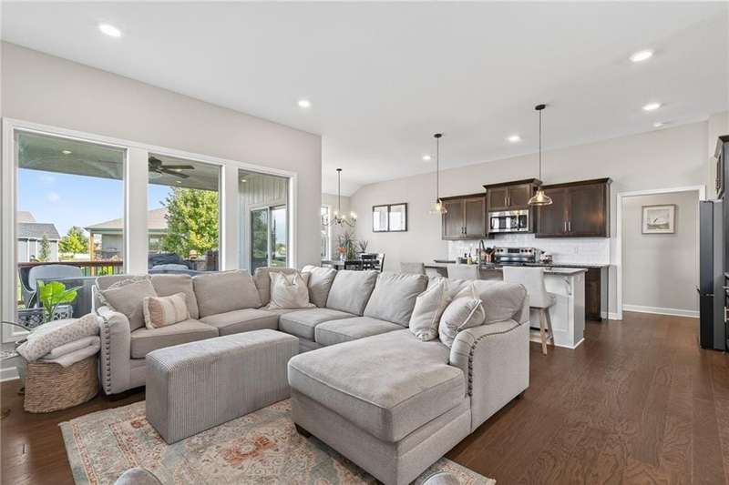 Beautiful 5 bedroom, 3.5 bath, 1.5 story home with a 3 car garage located in the highly sought after Estates of Wolf Creek,Johnson County, Spring Hill. The main floor features a spacious primary suite with vaulted ceiling, ceiling fan, walk-in closet, double vanity, tiled floor, walk-in shower, and stunning views of the pond. Three additional bedrooms are located upstairs, while the daylight finished basement offers a family room, rec room, fifth bedroom, and a third full bath. The great room boasts wood floors and a cozy stone fireplace, and outdoor living is enhanced by a deck and covered deck, perfect for enjoying pond views and breathtaking Kansas sunsets. Sprinkler System! Enjoy all the amenities this beautiful community offers, including a scenic pond, walking trails, and a neighborhood pool.