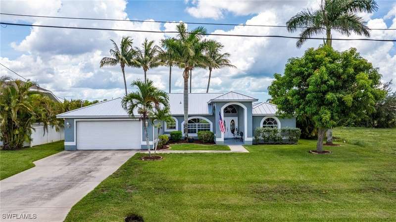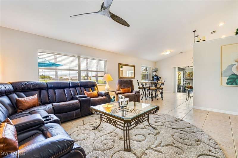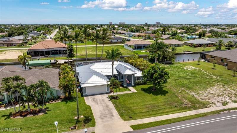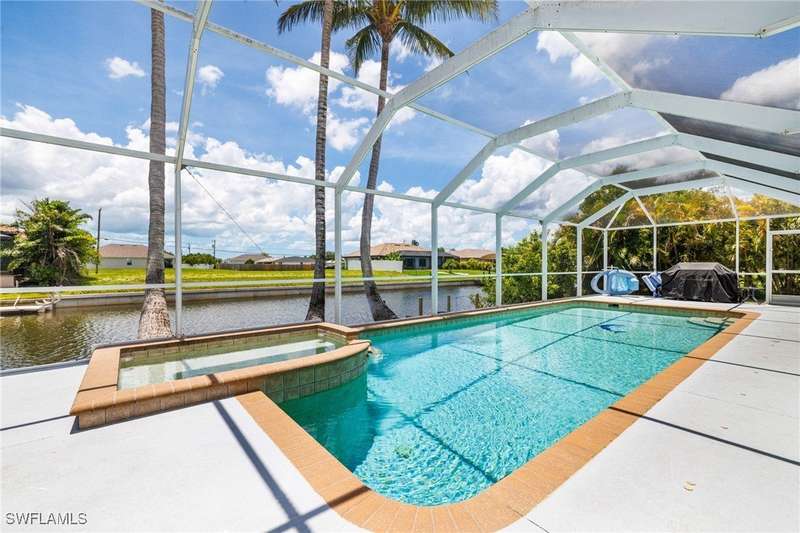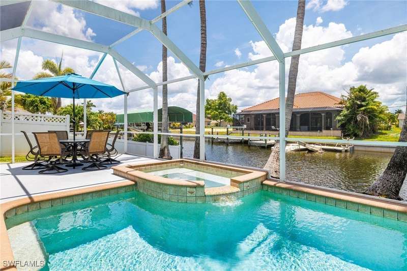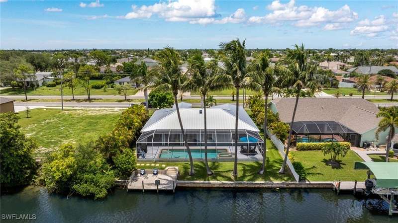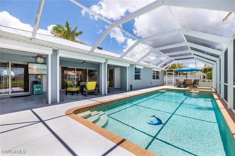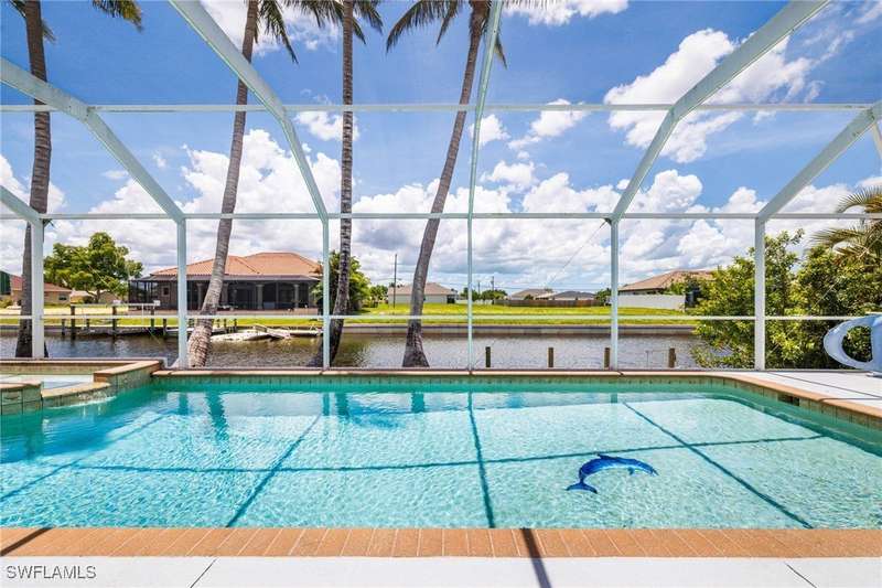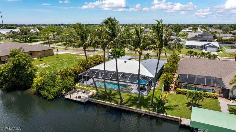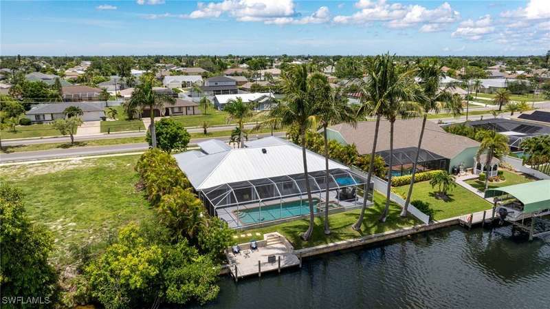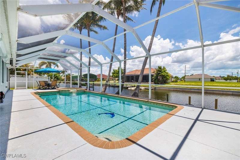 Beautifully Updated SW Gulf Access Pool Home with Southern Exposure! Welcome to your dream home in sunny Southwest Florida! This lovingly maintained and thoughtfully updated waterfront pool home offers the perfect blend of style, comfort, and convenience - all set on a Gulf-access canal with highly desirable Southern exposure on the pool for sun-filled days year-round. Step inside to over 2,000 square feet of living space under air, featuring tile flooring throughout, cathedral ceilings, and an open, airy layout. The spacious entry leads into a welcoming living and dining area, where large sliders open to a generously covered lanai, ideal for seamless indoor-outdoor living. The heart of the home is the open-concept kitchen and cozy breakfast nook, also featuring direct access to the pool and lanai - perfect for entertaining or enjoying quiet waterfront views. The owner's suite is privately tucked away, offering a serene retreat with dual closets, dual vanities, a walk-in shower, a soaking tub, and its own sliders to the pool area. Two guest bedrooms are located on the opposite side of the home for added privacy and flexibility. Outside, the lush landscaped yard feels like a private Florida oasis - complete with a fruit-bearing mango tree and space to relax or entertain. For peace of mind, the home includes electronic storm shutters across the back and a removable pool fence for family safety. Recent Improvements and Upgrades Include but not limited to: New Pool Heater (2025), New Pool Pump (2021), New AC Condenser (2024), New Metal Roof (Post-Hurricane Ian, 2023), New Dishwasher (2023), Refrigerator (2022), Induction Stove (2020), Sliders Serviced & Adjusted (2024), New Garage Door Springs (2024), Exterior Painted (2018), Updated Lighting & Ceiling Fans...and more! This home is move-in ready, meticulously cared for, and truly a must-see. Schedule your private showing today and start living the Florida lifestyle you've been dreaming of!