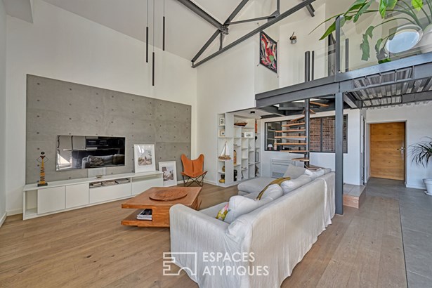 The open kitchen blends harmoniously into this cathedral-style space, ideal for sharing convivial moments.