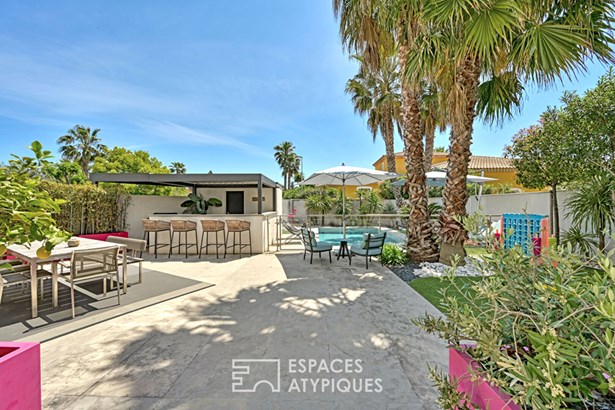 Outside, a large south-facing wooden terrace extends towards a Balinese-style swimming pool, a real invitation to relax.
