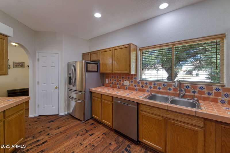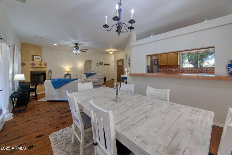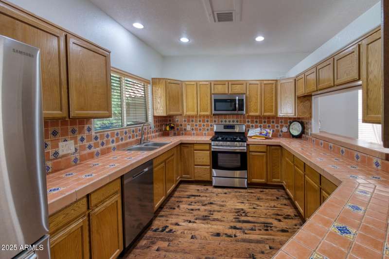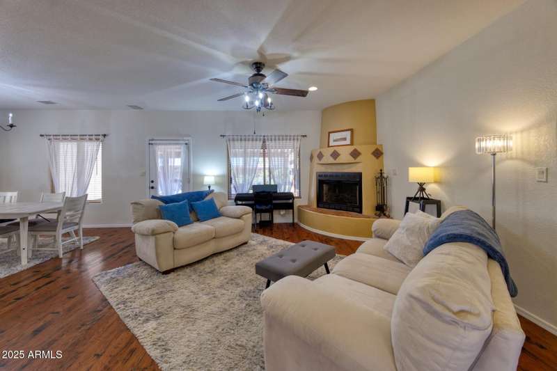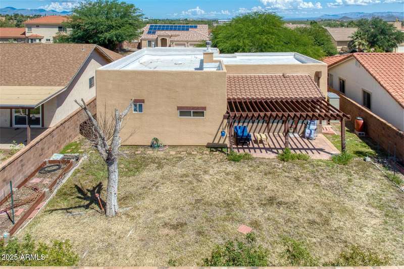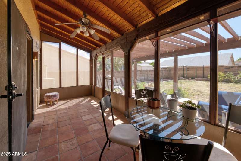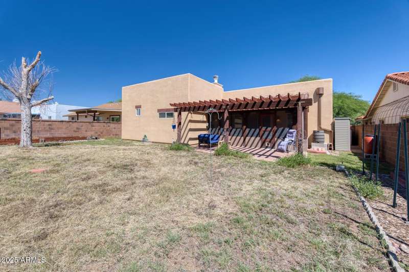 Charming 3BD/2BA Santa Fe-style home in Mesa Verde Estates with 1,585 sq. ft. of upgraded comfort! The gorgeous tree out front sets tempo for this wonderful home. An open floor plan centers around a kiva beehive fireplace, perfect for relaxing or entertaining. The chef's kitchen boasts stainless appliances, tile counters, built-in microwave, pantry, and abundant cabinetry. Highlights include gorgeous newer flooring, newer AC, recent roof coating, updated toilets, and thoughtful upgrades. The spacious primary suite offers patio access, walk-in closet, dual vanity, soaking tub, and separate shower. Outdoor living shines with a via screened AZ rm, tile-floored patio, pergola, lush lawn, and raised garden beds, a birdwatcher's paradise! Extended two-car garage w/side access and move-in ready.
