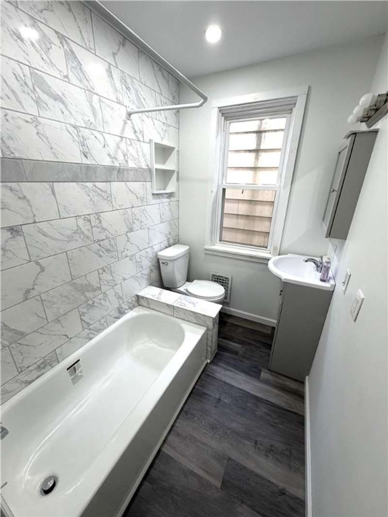 Move in ready 3 bedroom home with 2 full baths. Relax on the large front porch. Generous living & dining rooms with hardwood floors. Plenty of cabinets in the updated kitchen with space for a small table. A full bath rounds out the first floor. Upstairs you'll find three spacious bedrooms with hardwood floors and a brand new full bath. The third floor offers bonus space that could be used as a bedroom, office or additional storage. A flat back yard leads you to a 2 car garage with an automatic opener.