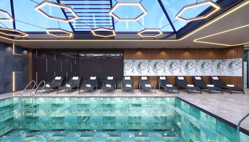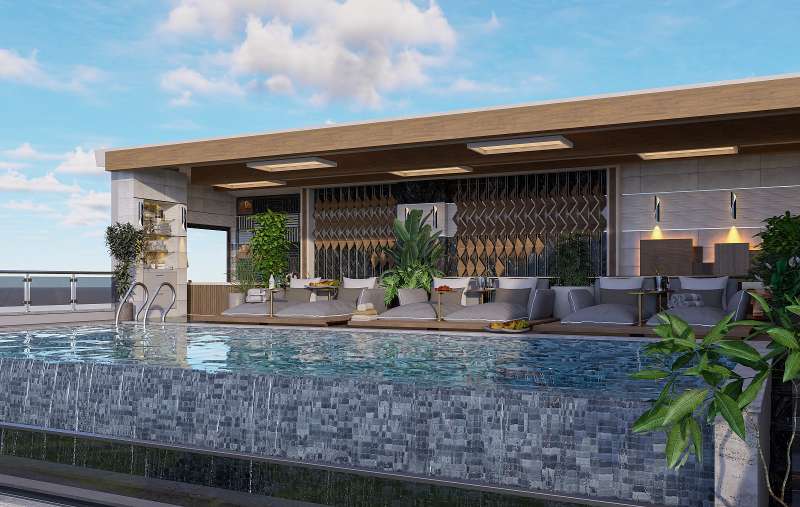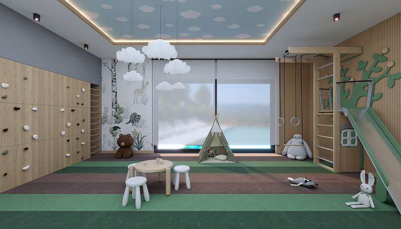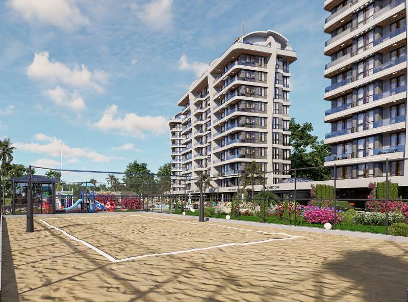 Built on a 20,500 m² land area, the project consists of 3 blocks. The complex features indoor and outdoor swimming pools, an aquapark pool, a children’s pool, barbecue areas, outdoor fitness areas, foot billiards, an amphitheater, a winter garden, a jacuzzi, children’s playgrounds, a beach volleyball court, football pitch, basketball court, tennis court, mini golf, relaxation areas, walking paths, a bicycle path, a charging station, a botanical garden, a pool bar, parking areas, giant chess, gazebos, a lobby reception, a children’s playroom, a fitness center, a cinema room, table tennis, a massage room, a Turkish bath, sauna, steam room, Russian sauna, market, laundry facilities, car rental service, shuttle service to the beach, and cleaning services.