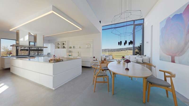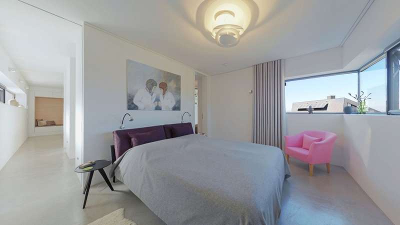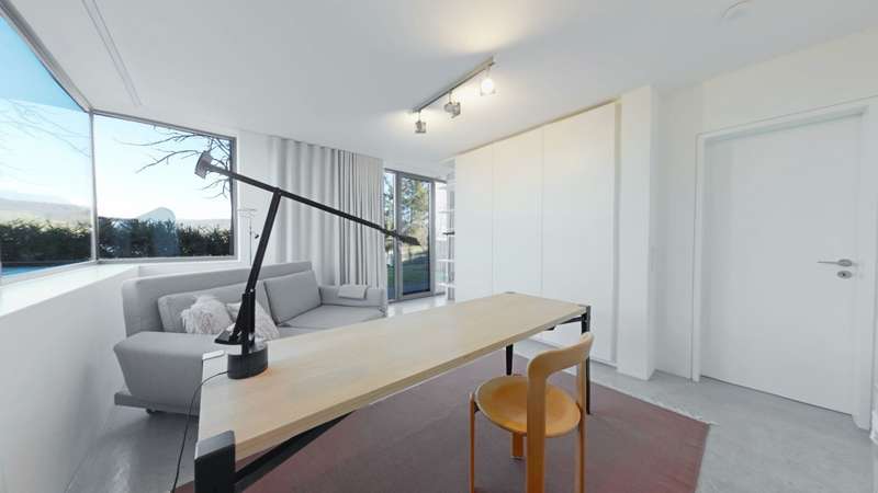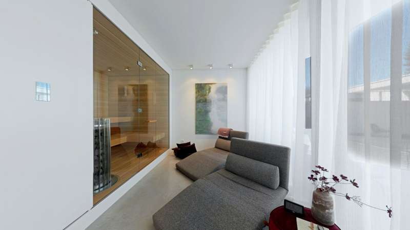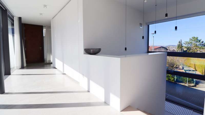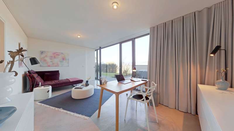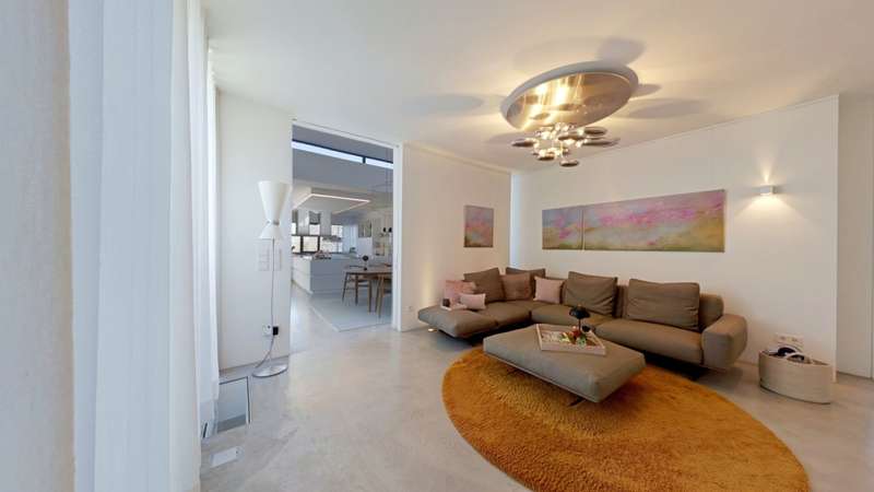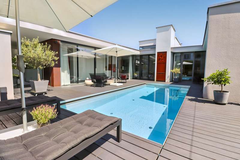 Property with a "conscience" A spacious and luxuriously furnished villa is for sale, which was built in 2006/2007 and has been extensively optimized time and again. It is technically and qualitatively up to date and ready to move into. As soon as you enter the house, you immediately get a feeling of lightness, openness and privacy. This is created by the atrium design combined with extensive window areas, which ensure a natural flood of light and room heights that are extraordinarily generous by local standards (dining area up to 3580 mm, remaining ground floor 2640 mm). Embedded in the "U" of the Atrium house on the ground floor is the beautiful pool surrounded by a large terrace area, which can also be variably extended by a walk-on cover. This is complemented by an integrated barbecue station and an adjacent pond. On the garden level, there is a further terrace area along the living room and bedrooms as well as a beautiful large green area with trees, which offers space for children to play and run around. Last but not least, the attractive kitchen with dining area should be mentioned as the focal point of the house, which invites you to enjoy cooking for yourself as well as "cooking up" with guests. It blends in exceptionally harmoniously with the overall living concept and is superbly equipped. This area is spacious and open to the dining area. A closed fireplace, glazed on two sides, rounds off the overall picture and creates a feel-good atmosphere. The directly adjoining living room can be directly integrated or separated by a floor-to-ceiling sliding door (inside the wall). The entire house is generously equipped with high-quality built-in wardrobes on both the ground floor and the garden level. The plot area is 700 m2. The clever integration of the house into the gentle slope, the garden-side window façade open to nature and the optimal garden design create a unique connection with the directly adjacent natural surroundings. The garden was designed in collaboration with a garden architect. The garden is equipped with a modern, fully automatic irrigation and sprinkler system for all beds and lawns as well as a lighting system controlled by motion detectors. Interested? We would be happy to provide you with a detailed exposé with further information on request. We would be happy to arrange a viewing and present this outstanding property to you in person. Get in touch with us!
