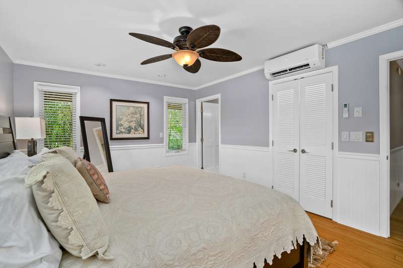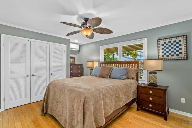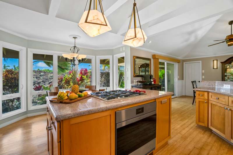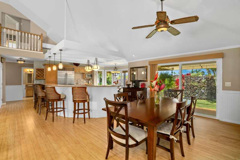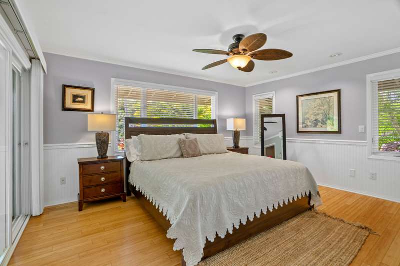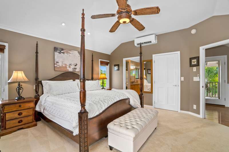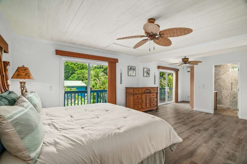 Natural light fills the open-concept living area, where vaulted ceilings and bamboo flooring bring warmth and volume. Two primary suites—one on each level—provide flexibility for multigenerational living or guest accommodations. The entire upper level is dedicated to a spacious primary suite with a walk-in closet, an additional washer/dryer and private lanai.