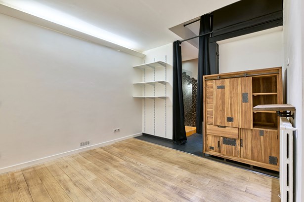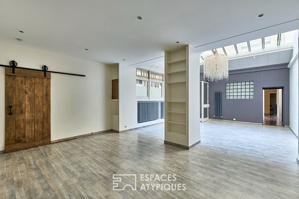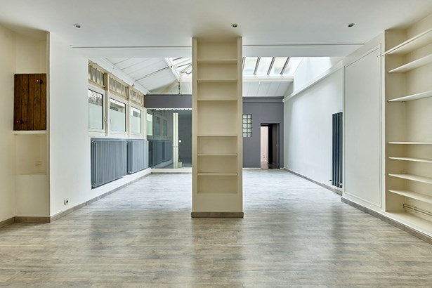 Located close to Square Montholon and the Marche Cadet, this 119.45 m2 (118.89 m2 Carrez) ground-floor loft is quiet and nestled within a classic Haussmann-style building.