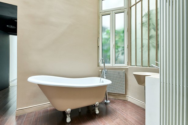 On the opposite side, a second bedroom features its own dressing area and an open bathroom with a clawfoot bathtub under the skylight, covering more than 21 m2.