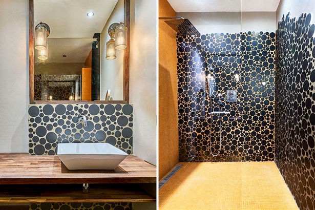 On the bedroom side, an industrial-style wooden door reveals the first bedroom, which spans nearly 27 m2. It includes a large walk-in closet and a private shower room with an Italian-style shower.