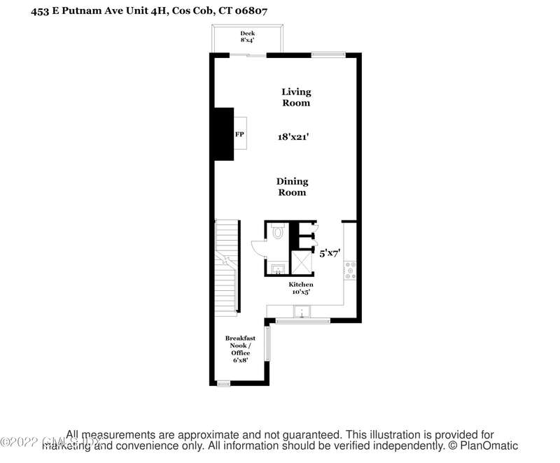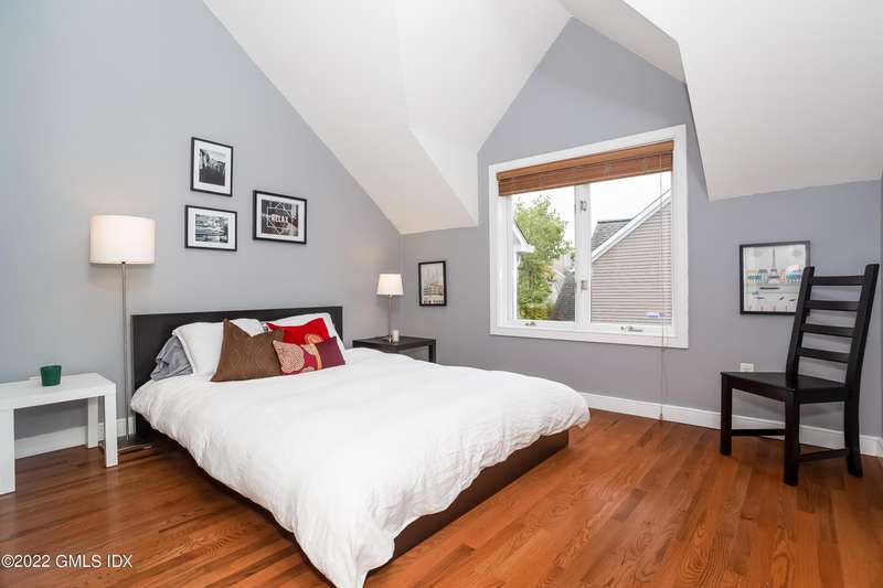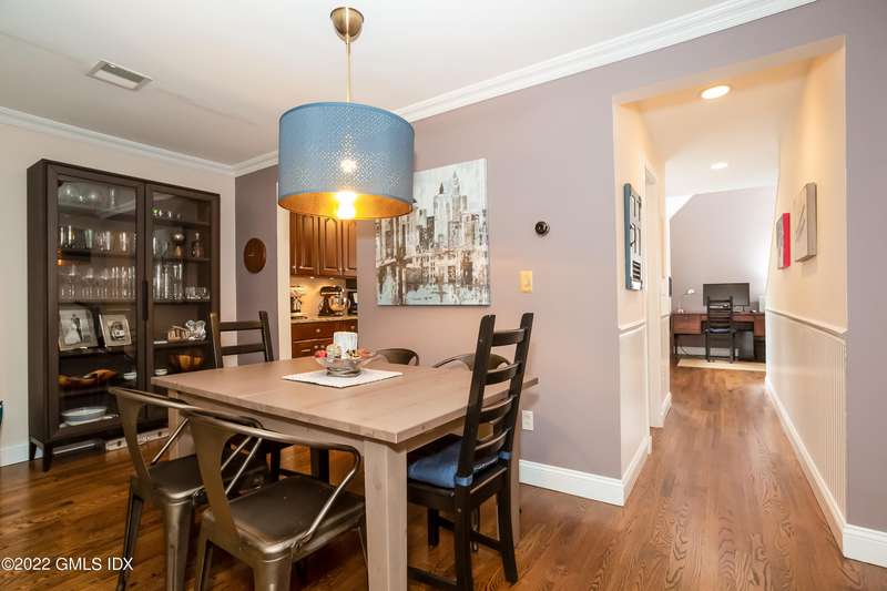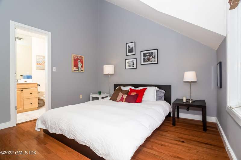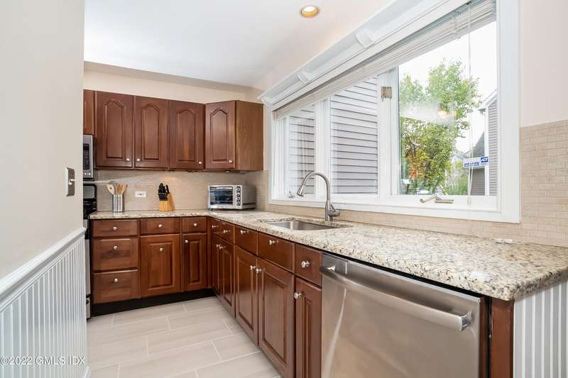 Beautiful 2-level townhouse. Kitchen w/granite countertops, tile floor & breakfast nook/office that overlooks the private courtyard. Living room and 1/2 BA make up the first floor. Primary Bedroom and BA and secondary bedroom with BA make up the second floor. Sunny, open floor plan. Living room & primary BR w/decks overlooking private backyard. Primary BR has cathedral ceilings & walk in closets. 2nd flr washer/dryer. Lots of attic storage & garage storage unit. Professionally landscaped courtyard w/lovely plantings. 2 parking garage spaces accessible by elevator. Located in the center of downtown Cos Cob, only minutes to train, restaurants, shops, schools & parks.