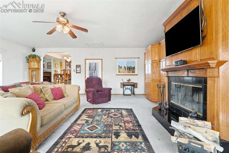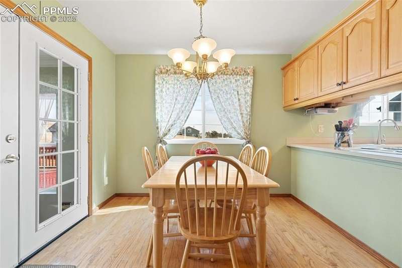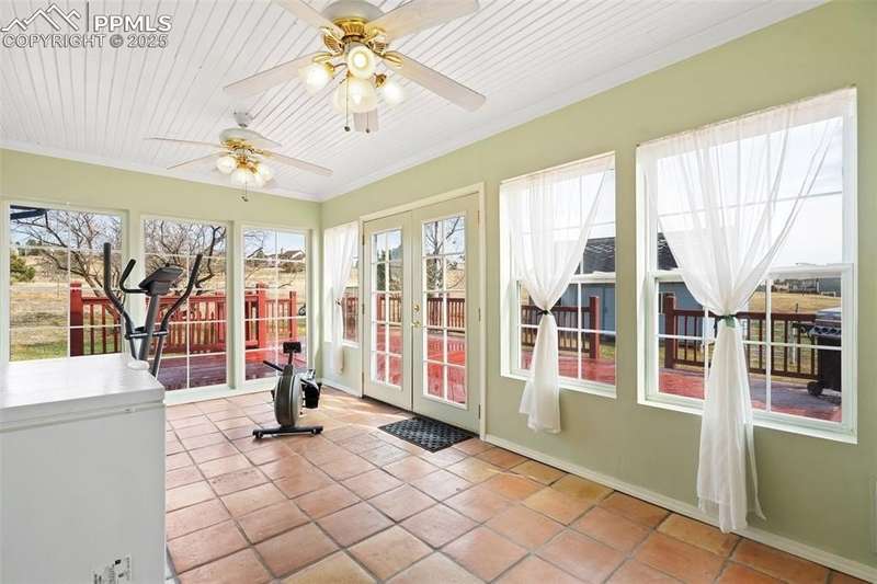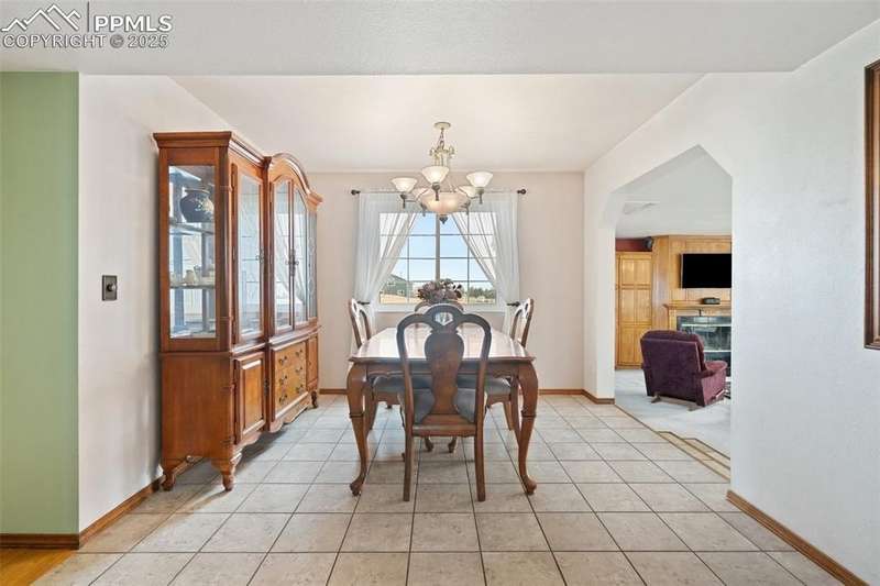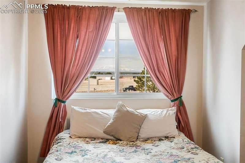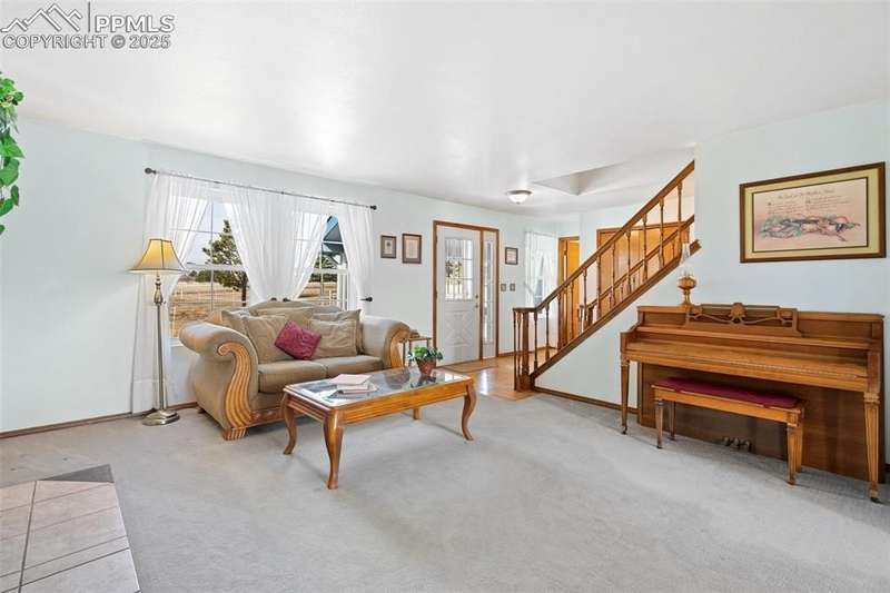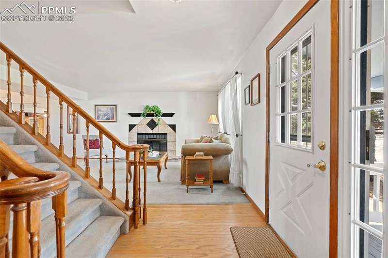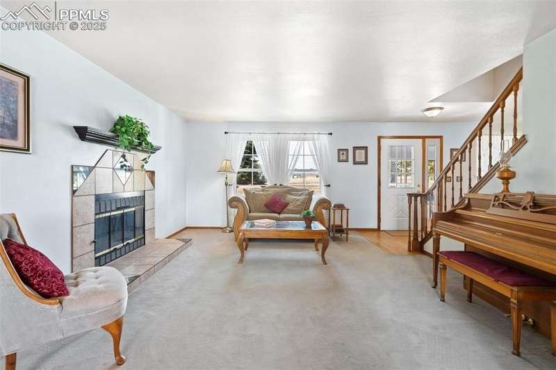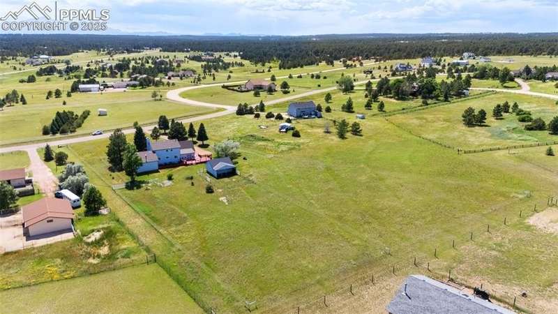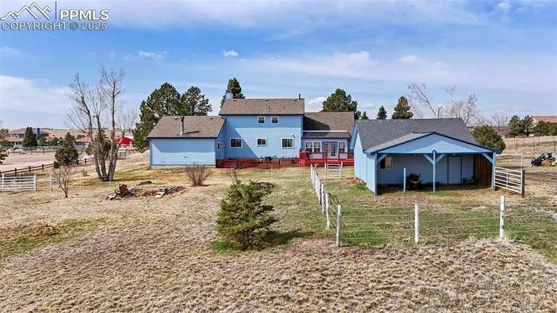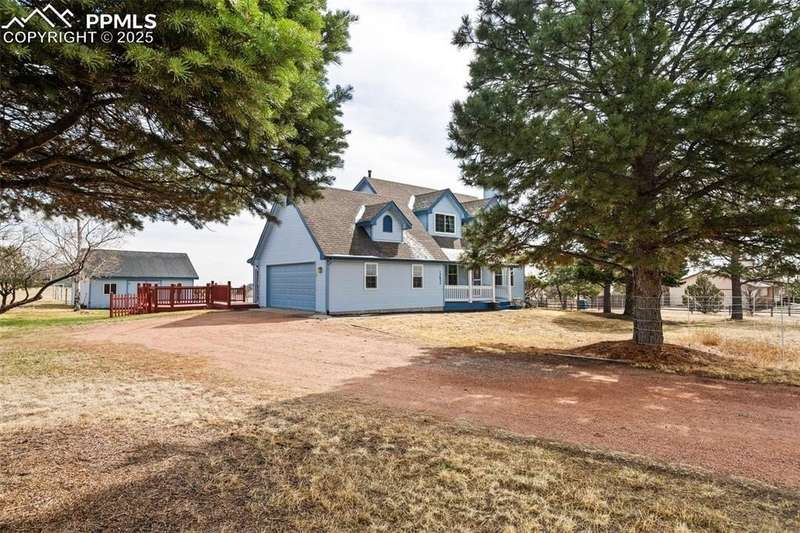 Situated in the desirable Latigo neighborhood, this home offers a tranquil setting with stunning views of Pikes Peak & a spacious, level lot adorned with mature pine trees. The property provides a peaceful & functional space, perfect for enjoying the natural surroundings. The exterior features a large, covered front porch & a generous back deck, ideal for outdoor relaxation & entertaining. A 24x20 shed/workshop with attached loafing shed provides convenient storage & shelter, with plenty of space for hay storage as well. The front yard is fully fenced & two separate pastures in the back offer secure areas for animals or recreational use. Inside, the home boasts a thoughtfully laid-out floor plan with separate living & dining rooms, along with a spacious family room that has abundant natural light from large windows, built-in shelves & a cozy fireplace. The family room also offers direct access to the back yard. The kitchen features an eat-in area that flows into a large, tiled sunroom with walk-out to back deck, creating a great flexible space for various needs. The main level also includes a half bath & a laundry room for added convenience. Upstairs, you'll find three well-sized bedrooms & two full bathrooms, including a dedicated primary suite with an attached bathroom & a walk-in closet. The fully finished basement offers even more living space, with a large rec/family room & an additional flexible area, currently used as a non-conforming bedroom. A third bathroom & extra laundry hook-up in the basement provide additional functionality. This home offers a fantastic blend of indoor & outdoor living, with plenty of space & beautiful views, all in the desirable Latigo neighborhood. Residents enjoy access to the Latigo Equestrian Center as well as the planned neighborhood easements for riding. Located in the highly regarded D-49 school district, this property also provides quick access to Meridian Road & Highway 24, making commuting & daily errands a breeze.