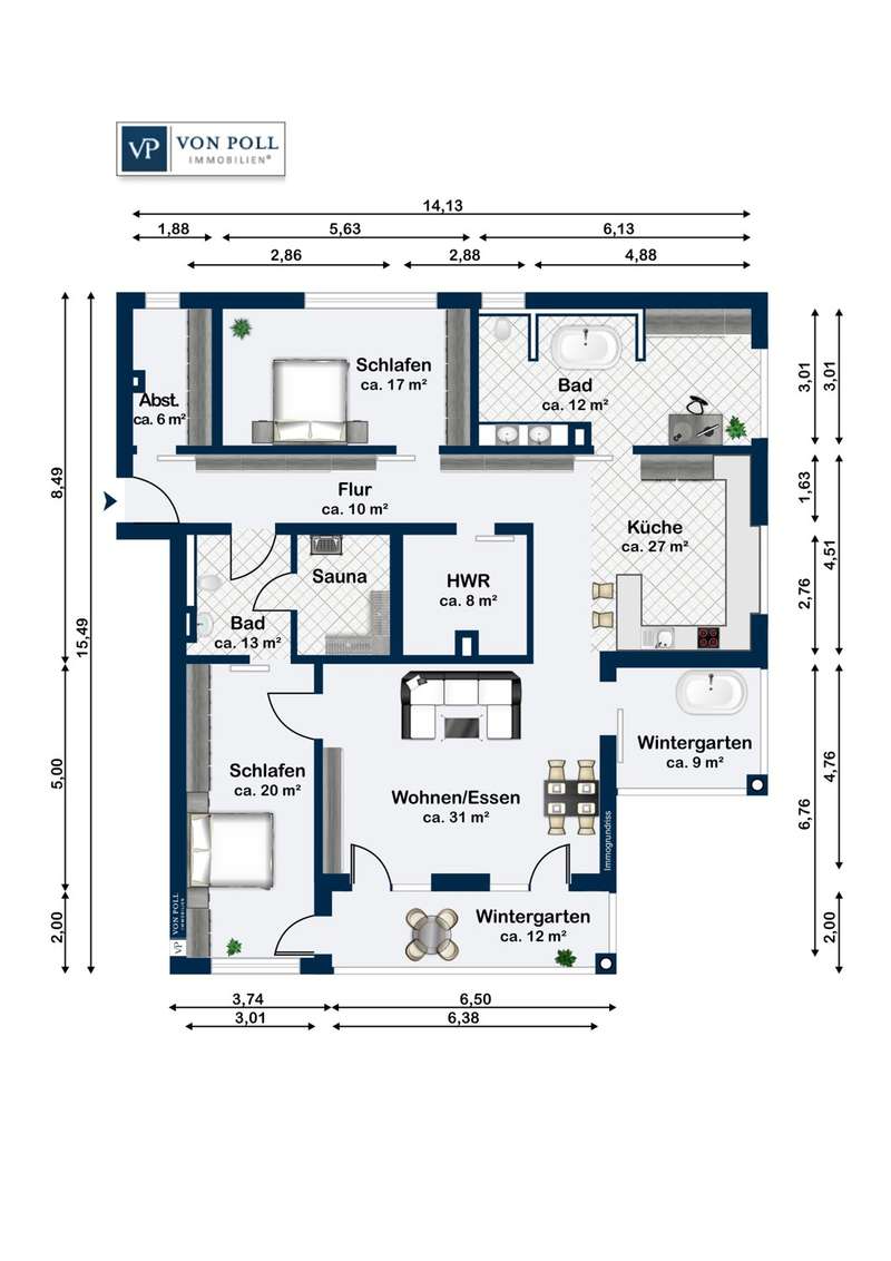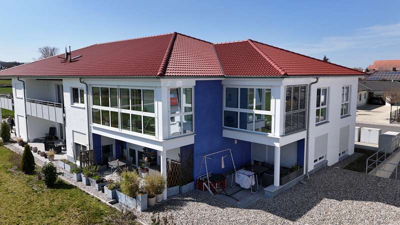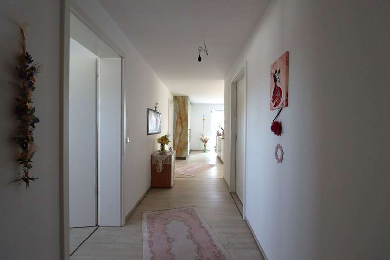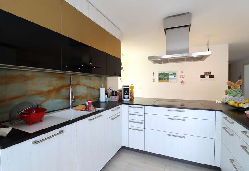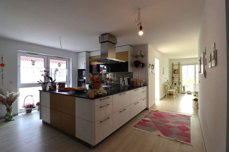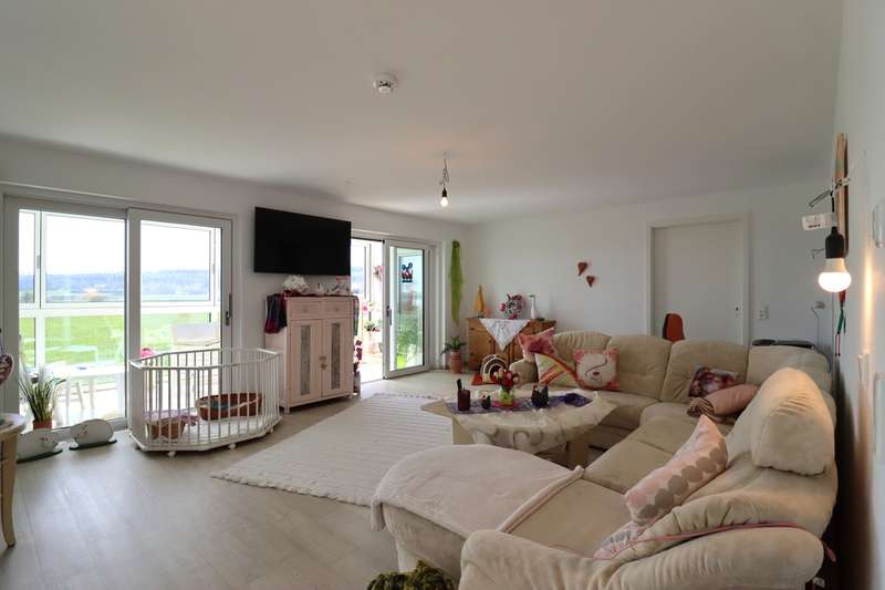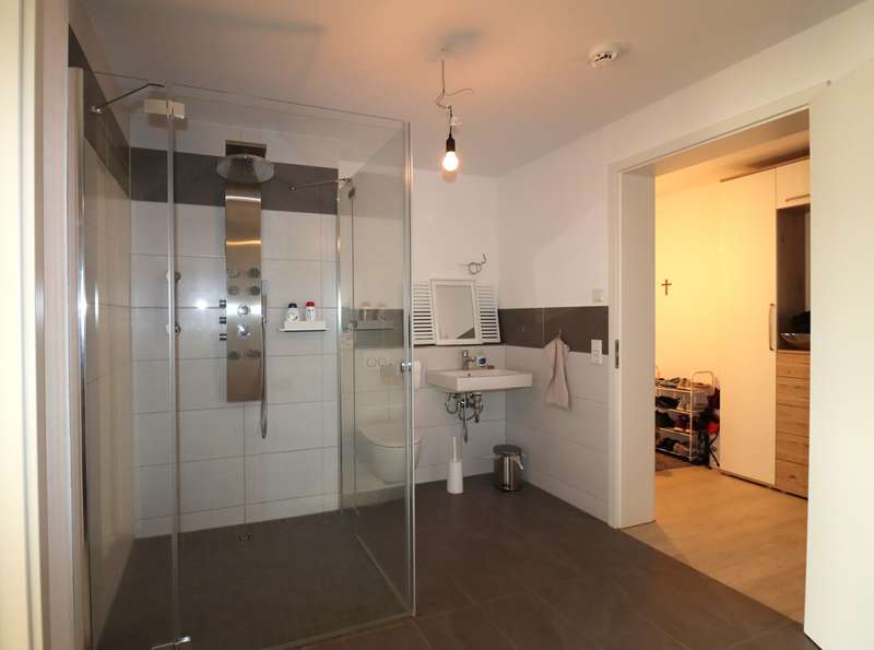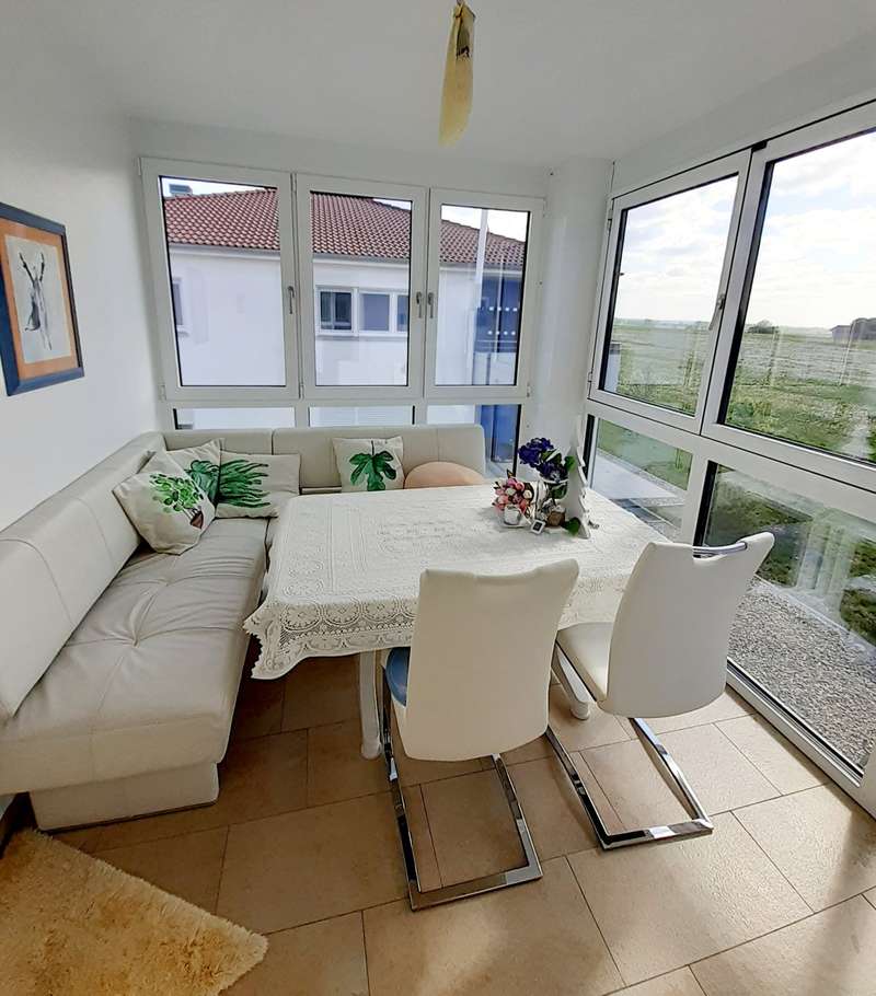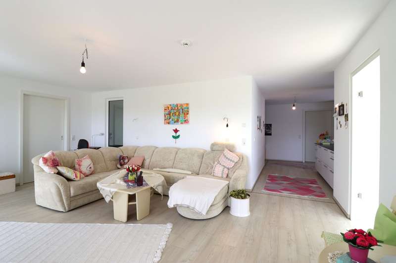 This light-flooded 4-room apartment, which was built in 2021, awaits you in a quiet and modern new-build development and impresses with its open, well thought-out interior design. The combination of high-quality fittings, spacious floor plan and natural views makes this property a real dream home. The heart of the apartment is the large, bright living room with floor-to-ceiling windows and two direct entrances to the cozy conservatory. From here, you can enjoy the unobstructed view of the greenery - a perfect place to relax or socialize. Directly adjacent is the master bedroom, which also has access to the conservatory and the living room. The two spacious bathrooms are particularly noteworthy: one offers a luxurious free-standing bathtub with a floor-to-ceiling window for a very special wellness feeling, while the second is equipped with a modern wellness shower. Both bathrooms naturally have a toilet and washbasin and are stylishly furnished to a high standard. The open kitchen is not only well-maintained, but also equipped with high-quality appliances and pleasantly bright thanks to a large window. The kitchen area is complemented by a practical pantry and a separate utility room with space for a washing machine etc. There is also another small room that could be used as a study. Another highlight is the bright dining area with two window fronts, which is designed like a small, second conservatory and perfectly complements the living area. The apartment is heated by a modern liquid gas heating system from 2020 and a heat pump, which provides efficient and cozy warmth. This property combines modern living quality with a spacious layout and plenty of light - ideal for anyone who wants to live in style, quietly and close to nature.