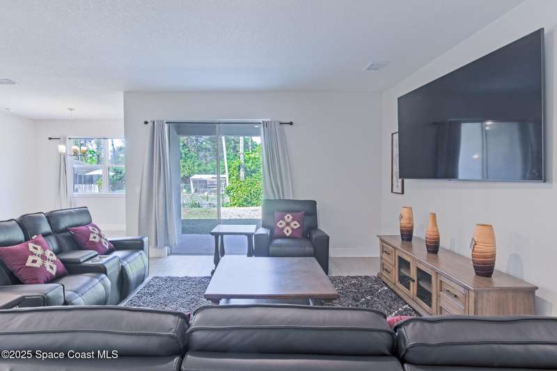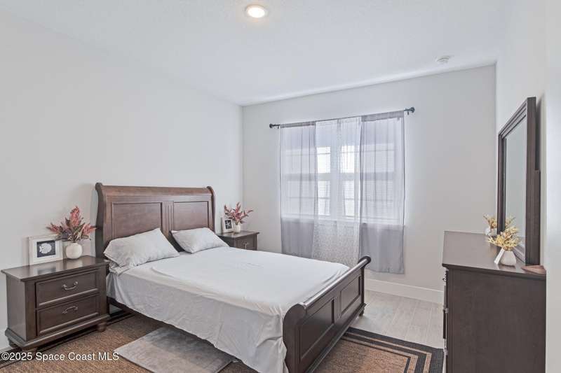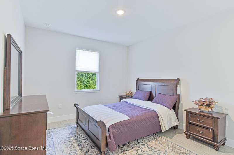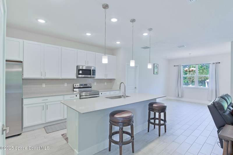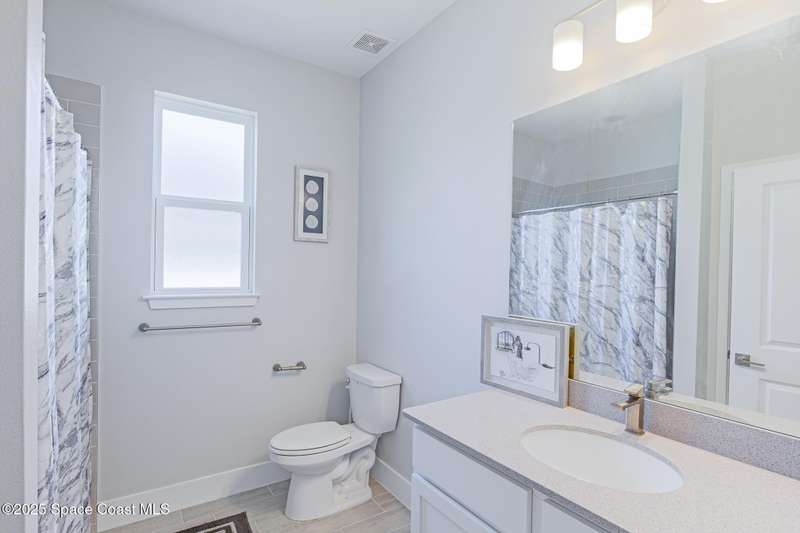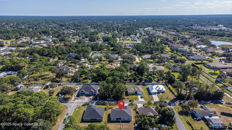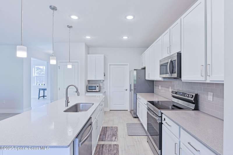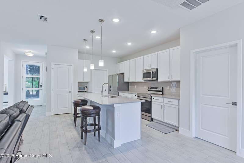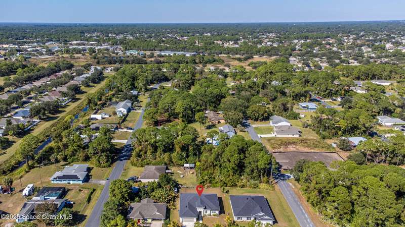 Experience modern Florida living in this brand-new 2023 construction, energy-efficient 3BR/2BA home with huge bonus room in a quiet, desirable area of Palm Bay. This high-quality build offers quartz countertops, luxury tile plank flooring, 42'' hardwood cabinets, LED lighting, and one of the best price-per-square-foot values in Palm Bay. Enjoy an open floor plan with 9'4'' ceilings, a tray ceiling in the master, Energy Star stainless appliances, a 15-16 SEER AC, hybrid water heater, Low-E double-pane windows, and spray foam insulation in exterior walls and the attic for exceptional efficiency and sound reduction. Additional features include a covered lanai, irrigation system, and rain gutters. The elevated lot offers great curb appeal, and the backyard features mature mango and coconut trees for a true tropical touch. Style, efficiency, and value come together in this beautiful home!
