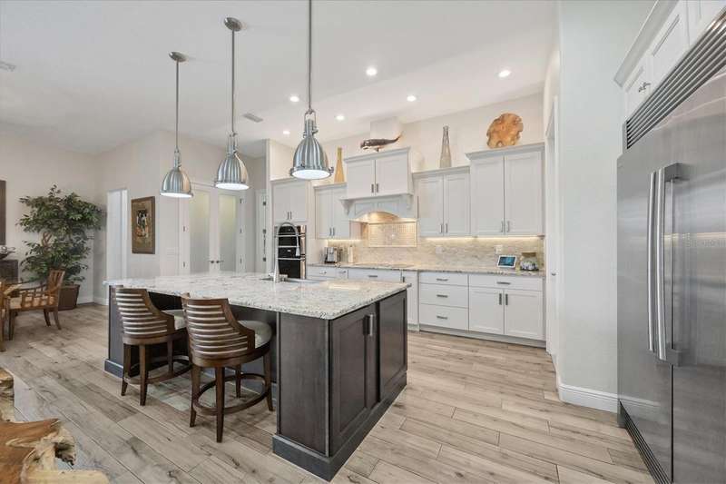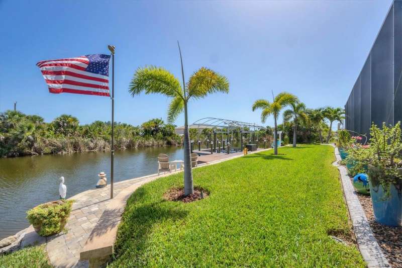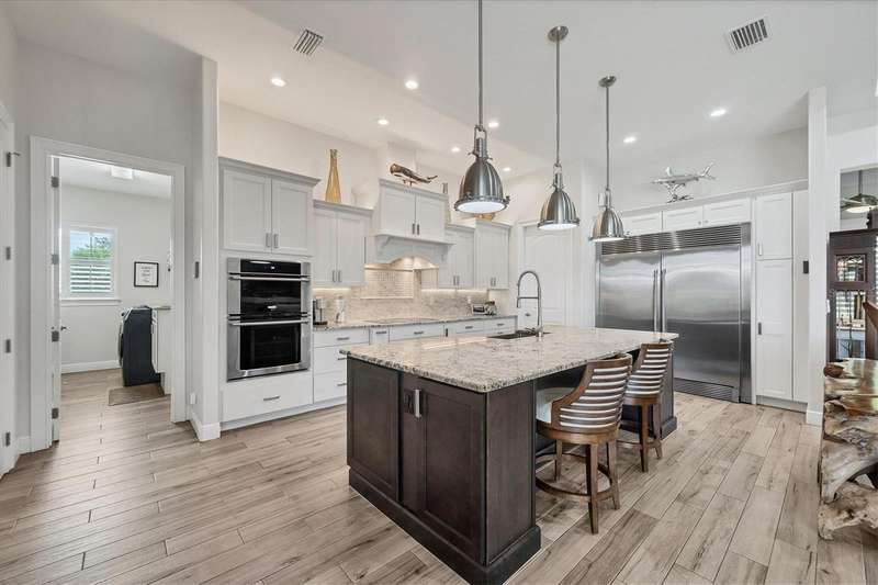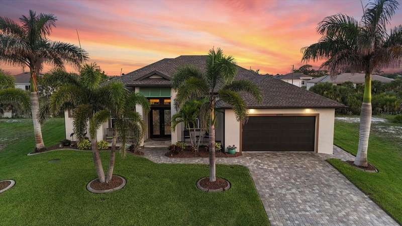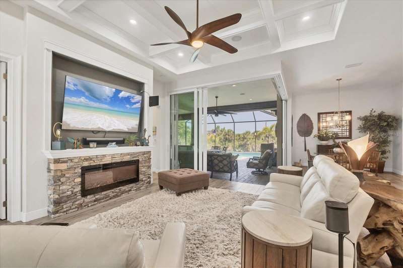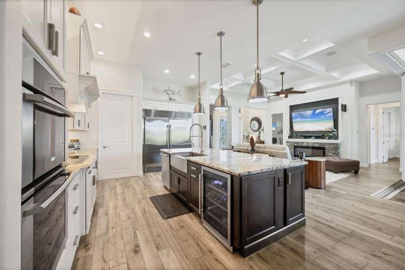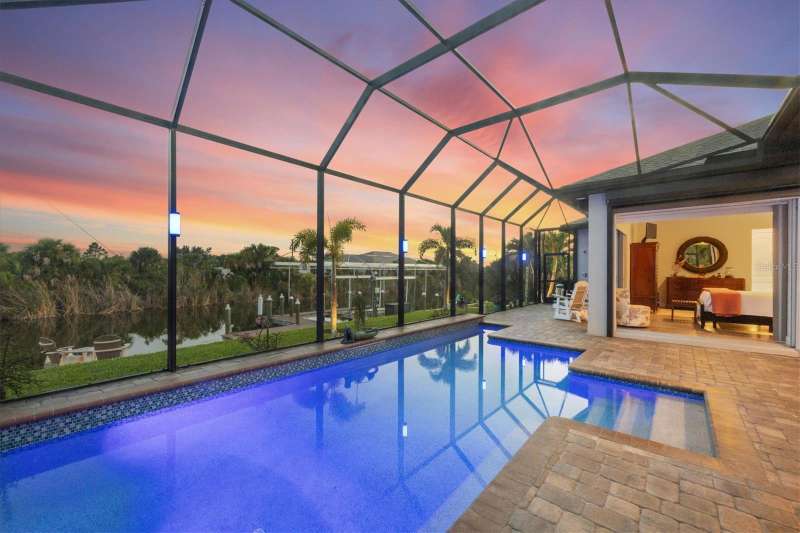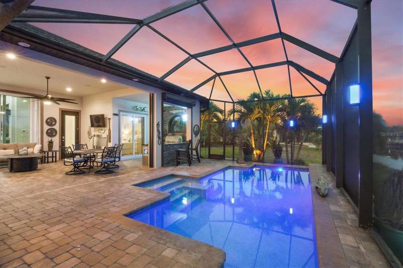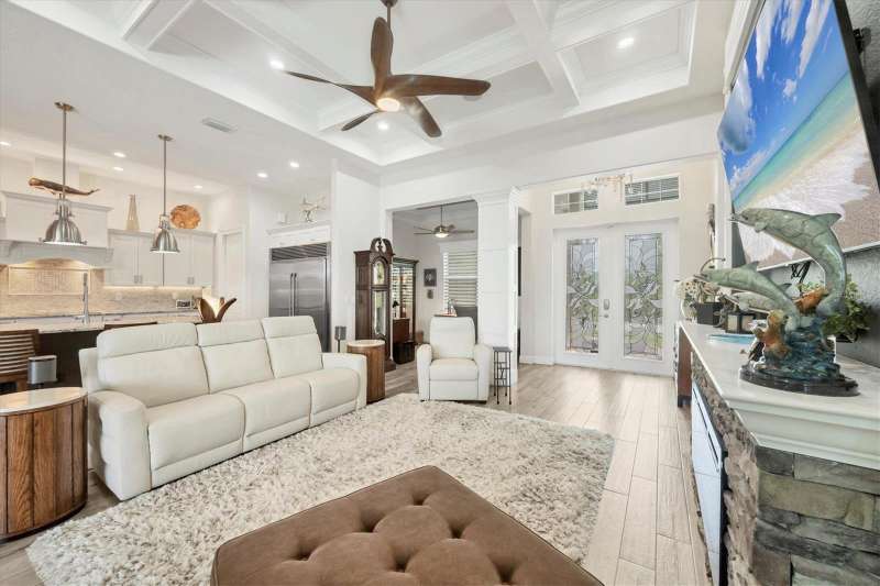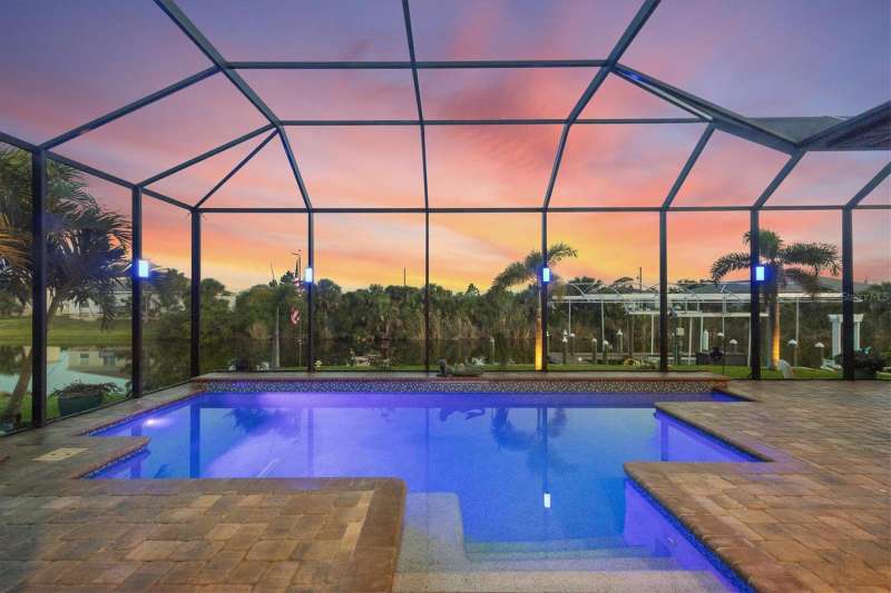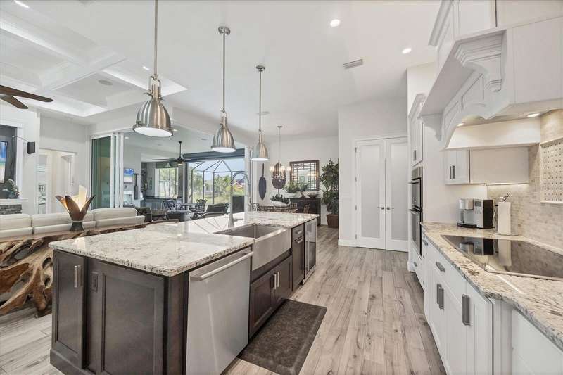 Tucked in a serene Florida waterfront community, this elegant 3-bedroom, 2-bath custom home is the perfect blend of luxury, comfort, and smart design. From the moment you arrive, it’s clear that every inch of this property has been thoughtfully crafted—from the paver driveway and travertine entrance to the gorgeous etched glass double doors that make a striking first impression. Inside, you’re greeted by rich wood-look tile flooring, custom tray ceilings, and a welcoming open layout that flows effortlessly from room to room. The living space is bright and open, with oversized sliders framing stunning water views that never get old. Whether you’re hosting a holiday party or simply relaxing by the electric fireplace with family, this home makes it easy to live beautifully. And the kitchen? It’s a chef’s dream. With a massive 9-foot quartz island, an Electrolux 5-burner induction cooktop, wall ovens, an oversized refrigerator/freezer, and high-end fixtures, cooking becomes a joy — not a chore. You’ll find yourself gathering here often, whether for morning coffee or sunset hors d'oeuvres. The primary suite is a peaceful retreat. Wake up to water views and step directly out to the lanai. The spa-style en-suite bathroom features an oversized walk-through shower, dual vanities, and a 13x8 walk-in closet so spacious it could be its own room. Across the home, two guest bedrooms ensure privacy and comfort for family or visitors. Step out onto the lanai and your private resort awaits. A heated saltwater pool with a soothing water feature invites you in for a dip. Entertain at the fully equipped summer kitchen with a Webber Summit grill and expansive bar space—perfect for laid-back evenings with friends. New pool screens installed in 2023 keep everything fresh and beautiful. And when a storm rolls in? Just press a button—automatic hurricane shutters protect everything, no need to move a single chair. As the sun sets, stroll down the lighted captain’s walk to your private 16-foot composite dock, complete with water and electric hookups and a walk-around 10,000 lb. boat lift—making every boat day easy and effortless. This home is not just beautiful, it’s built for peace of mind. From impact-resistant glass and electric shutters to Icynene insulation, Nest smart home features, and a newly painted exterior (2023), it’s as smart and secure as it is stunning. There are too many extras to list—but one walk through will show you: this is more than a home, it’s a lifestyle. Schedule your private tour today and experience the very best in Florida luxury living.
